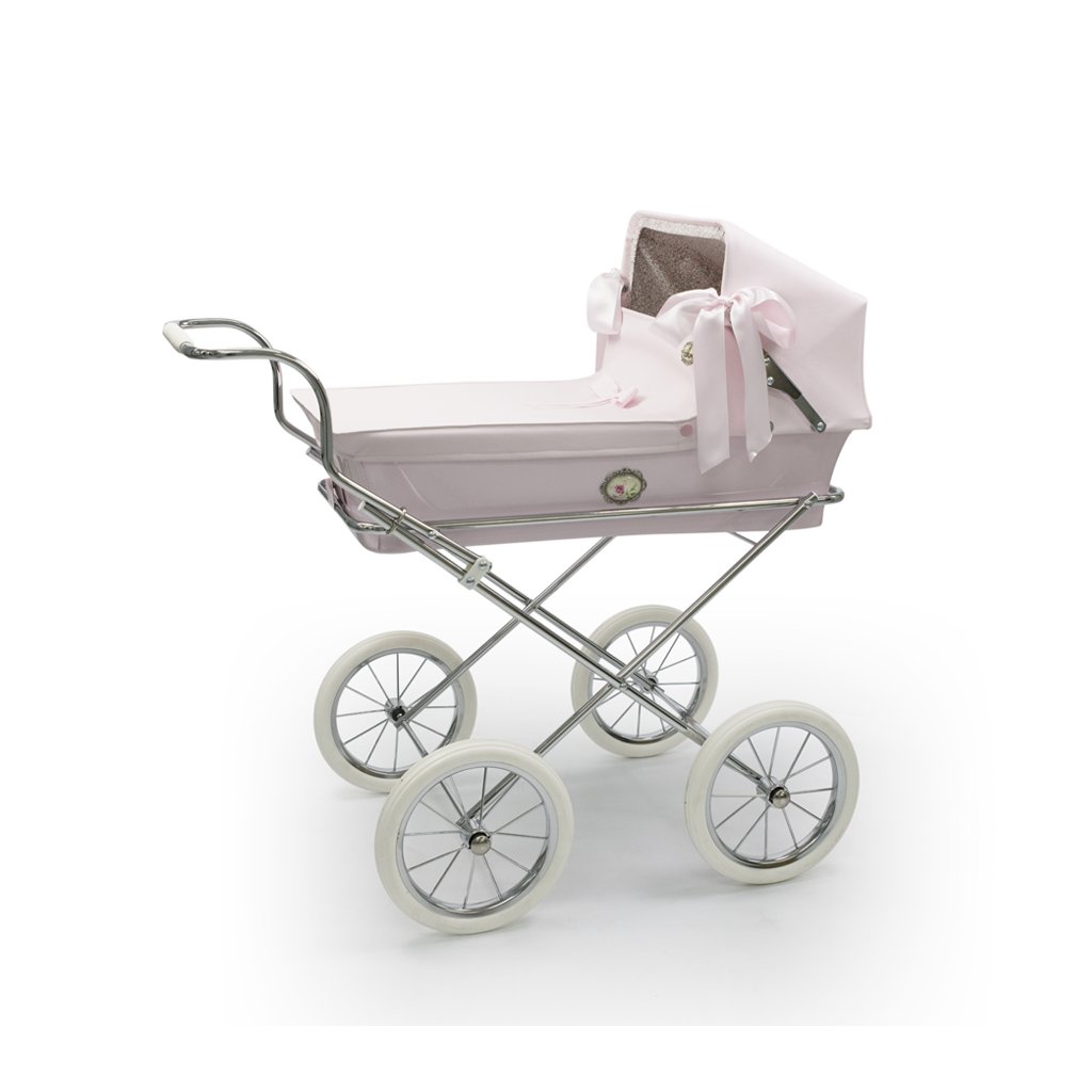 Detský luxusný kočík pre bábiky "Sweet pink" je súčasťou kolekcie Bebelux "Sweet". Vanička je vyrobená z bledoružovej lakovanej kože, strieška a kryt na vaničku je z kože Nappa a z vnútornej strany striešky je krásny kvetinový vzor. Súčasťou sú nádherné bledoružové mašličky.Kočík má chrómové kolieska s veľkosťou 210mm.