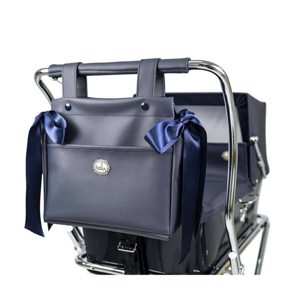 Praktická ručne robená taška ku kočíku Bebelux vyrobená z kvalitnej kože Nappa s vnútornou podšívkou ozdobená krásnymi saténovými mašličkami. Taška má praktické vonkajšie vrecko.