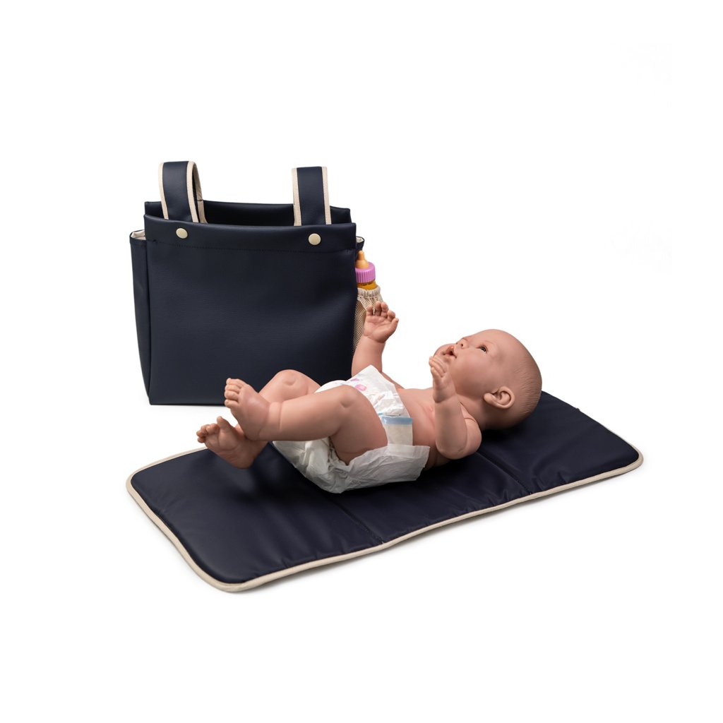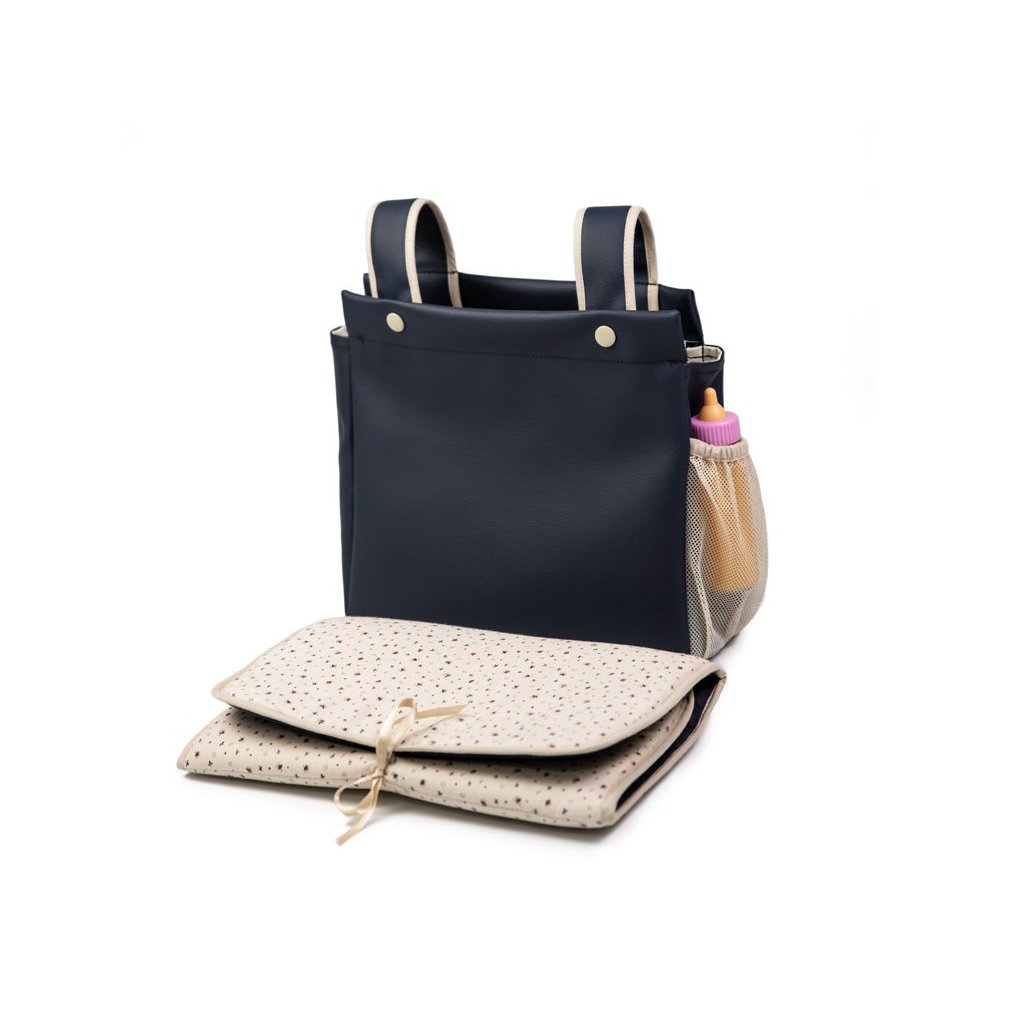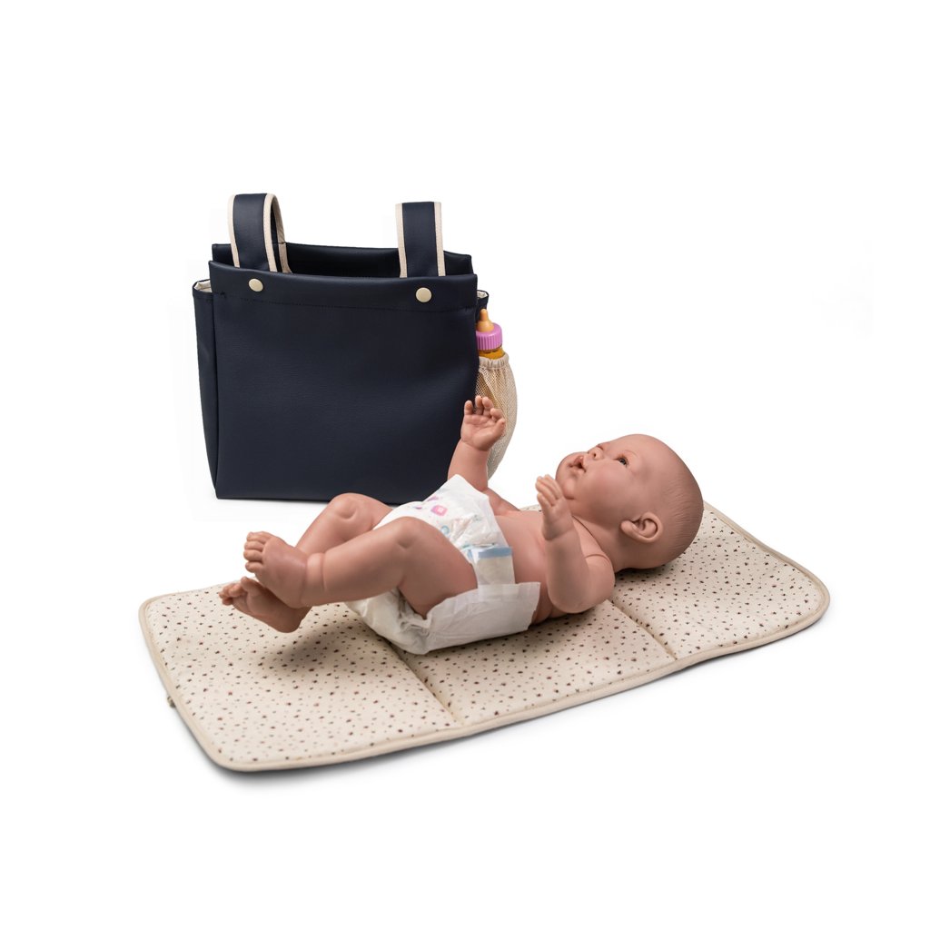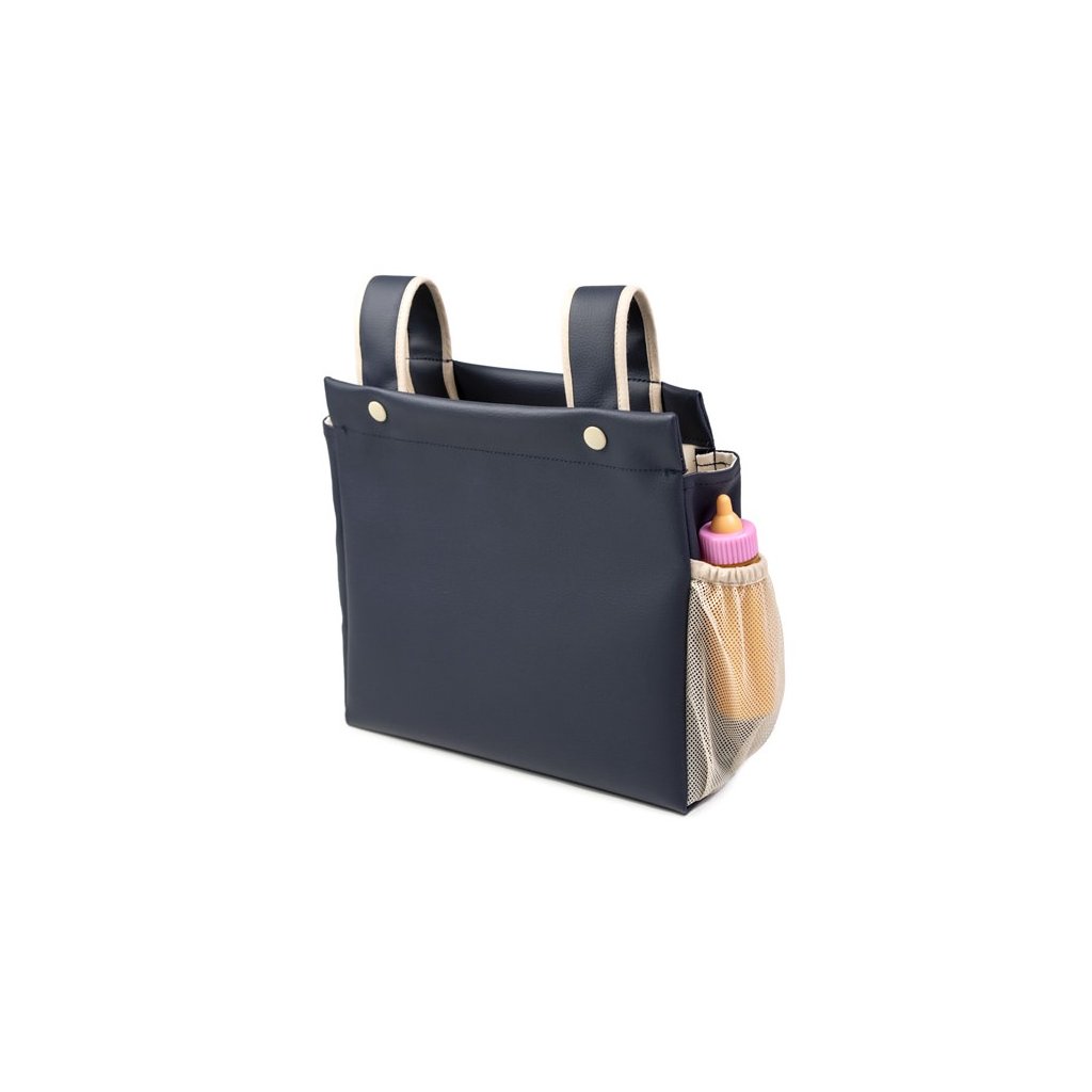 Praktická taška na kočík pre bábiky, ktorá je veľmi nápomocná pri prebaľovaní bábiky. Obsahuje 2 praktické priehradky, podložku na prebaľovanie a z bočnej strany má držiak na fľašku. Vyrobená z kvalitnej kože Nappa s vnútornou podšívkou. Ručne vyrábaná, 100% v Španielsku.