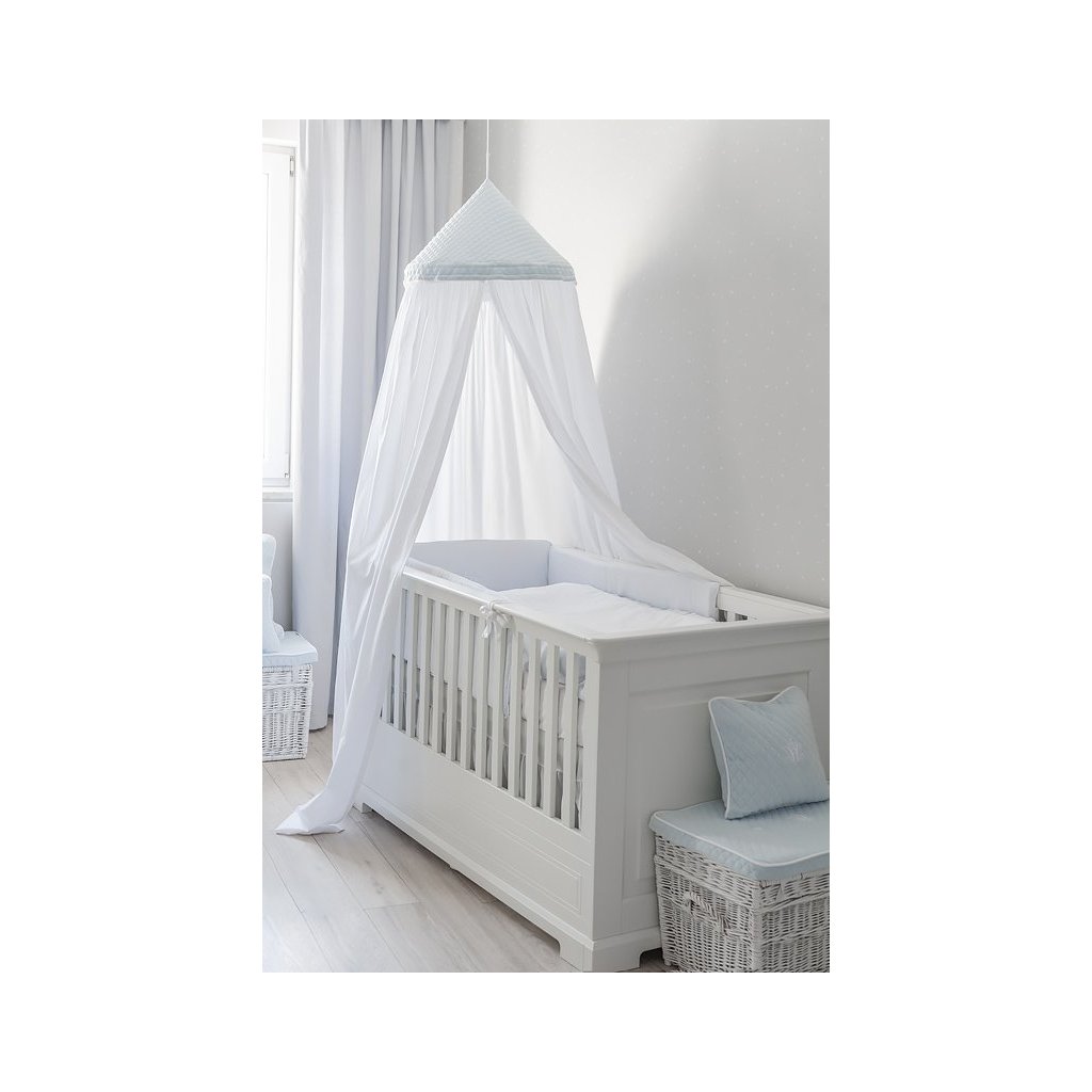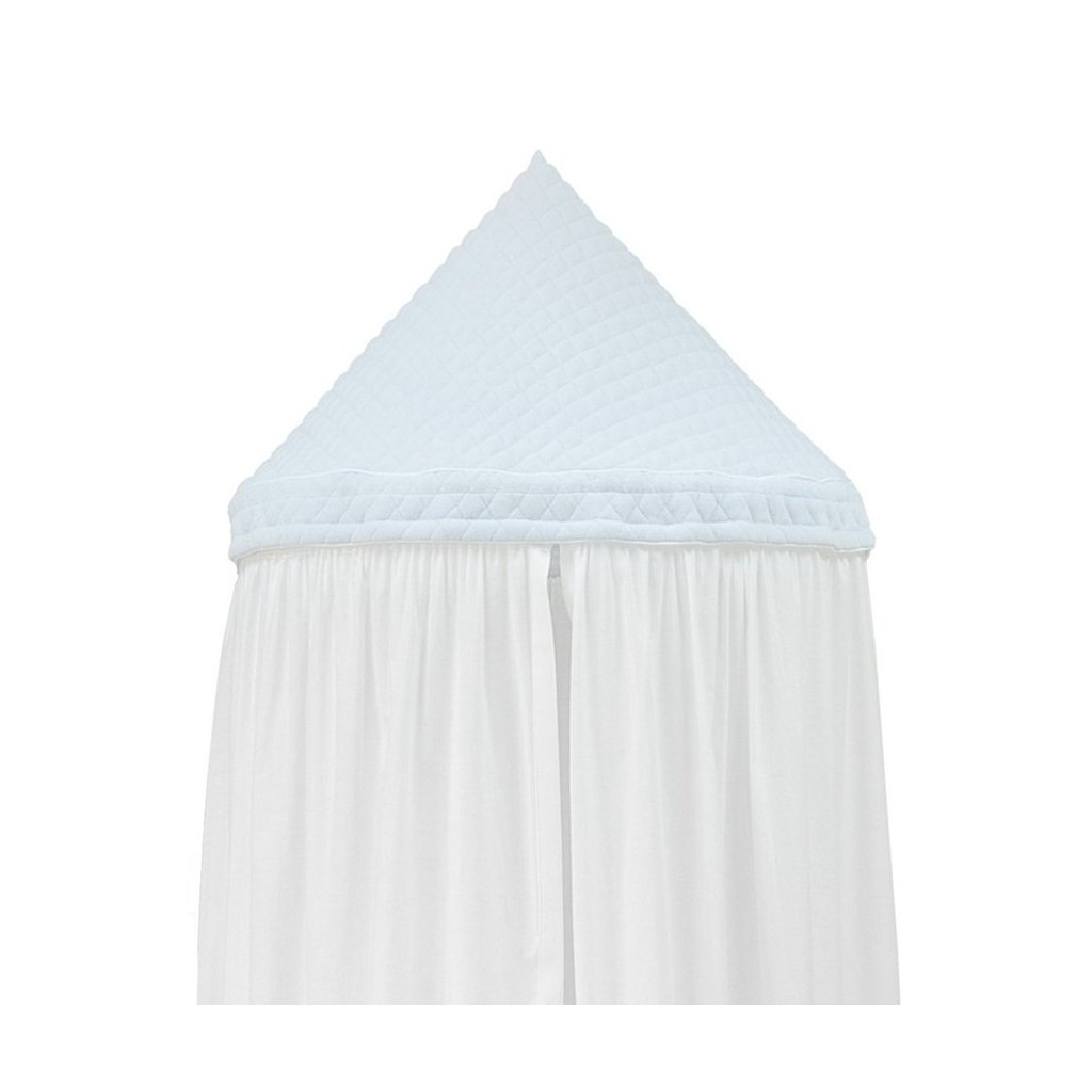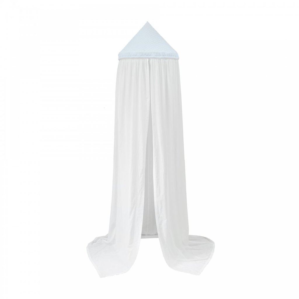 Krásny závesný baldachýn do detskej izby. Vyrobený z bielej jemnej bavlny a modrej prešívanej bavlny, zakončený krásnym volánom. Baldachýn je zavesený na strope, je vhodný do detskej postieľky a veľkej postele.