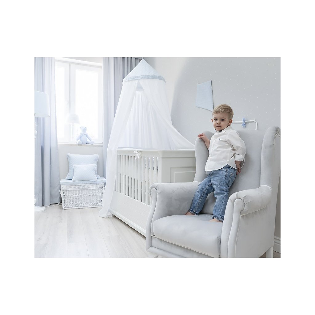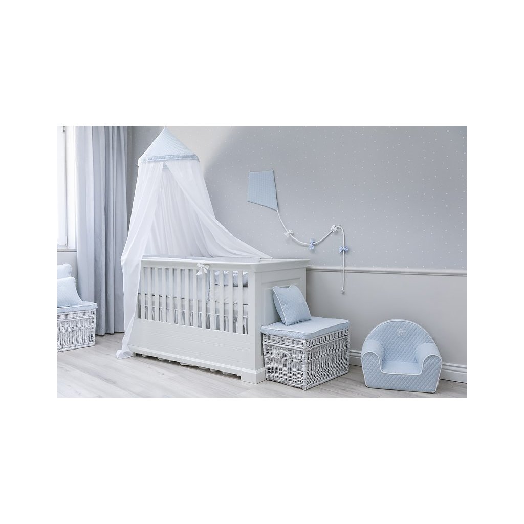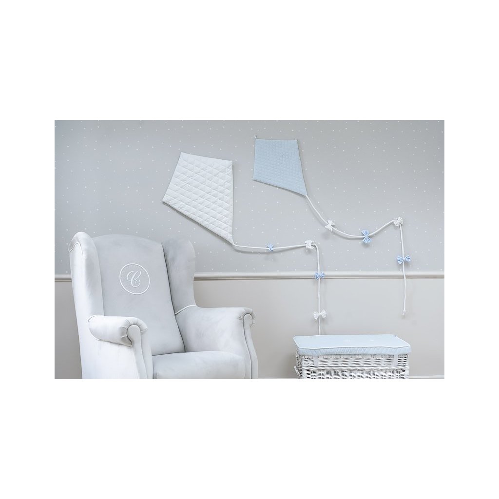 Krásny ručne vyrobený šarkan z kvalitného modrého textilu. Jeho biely špagát je ozdobený rozkošnými mašličkami v modrej farbe. Šarkan je originálna dekorácia do detskej izbičky.