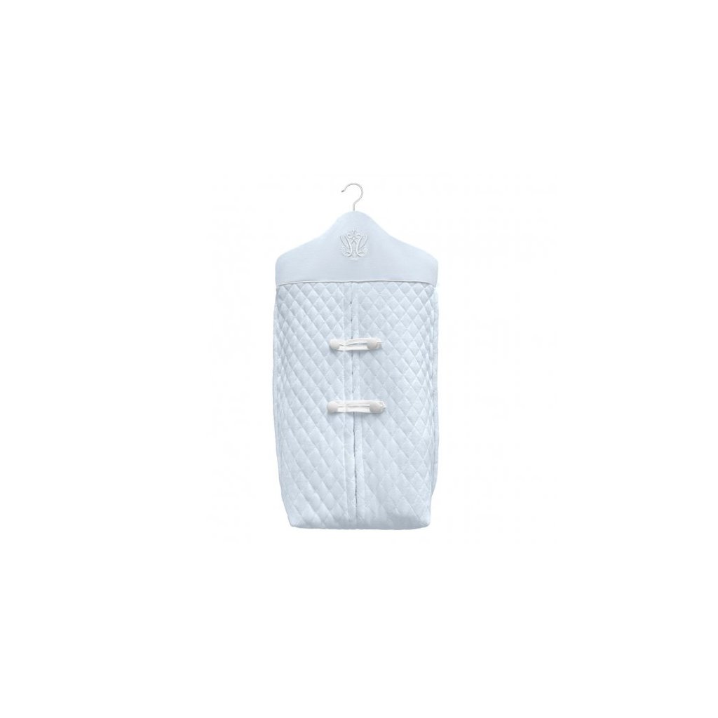 Praktický organizér na plienky z prešívanej bavlny v baby modrej farbe. Zdobený volánom a krásnym zapínaním na mašličku. Má vešiak, ktorý vám umožní zavesiť organizér na posteľ, komodu alebo dvere šatníka.