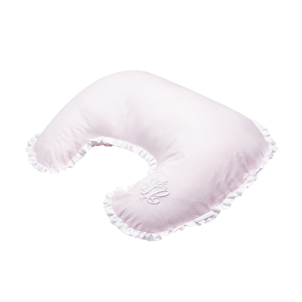 Rozkošný a praktický vankúšik nevyhnutný na kŕmenie vášho dieťatka. Vďaka mäkkej a elastickej výplni drží svoj tvar, dobre poslúži ako detský anatomický vankúšik alebo ozdobný dekoračný vankúšik. Vankúšik je vyrobený z bledoružovej bavlnenej látky a je ozdobený volánikom a bielym znakom. Snímateľný poťah je prateľný.