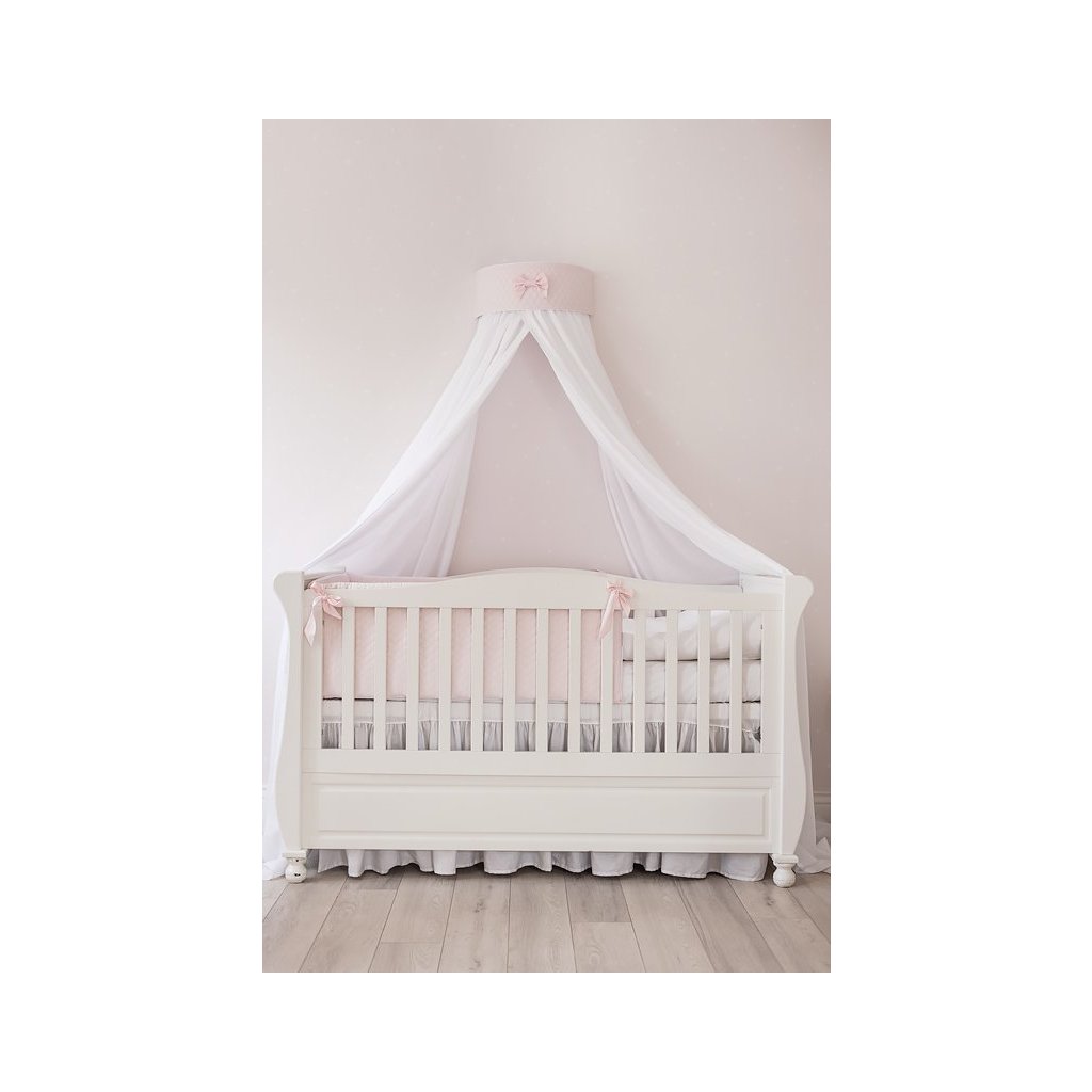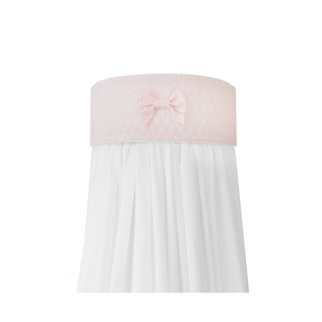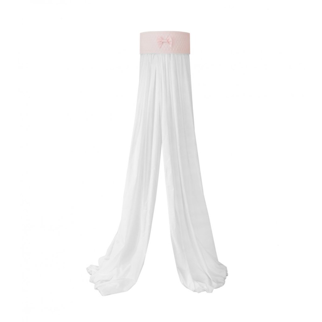 Krásny baldachýn do detskej izby. Vyrobený zo saténovej bielej bavlny a obohatený o elegantnú ružovú ozdobnú časť v tvare polkruhu. Upevnenie je potiahnuté baby ružovou prešívanou látkou zdobenou peknou mašličkou.