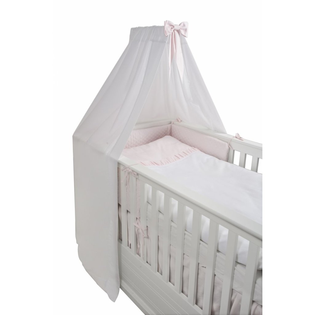 Krásny stojaci baldachýn do detskej izby. Vyrobený z bielej saténovej bavlny a ozdobený mašličkou v baby ružovej farbe. Baldachýn je elegantný doplnok, ktorý zútulní detskú postieľku a bábätko sa bude cítiť bezpečnejšie.