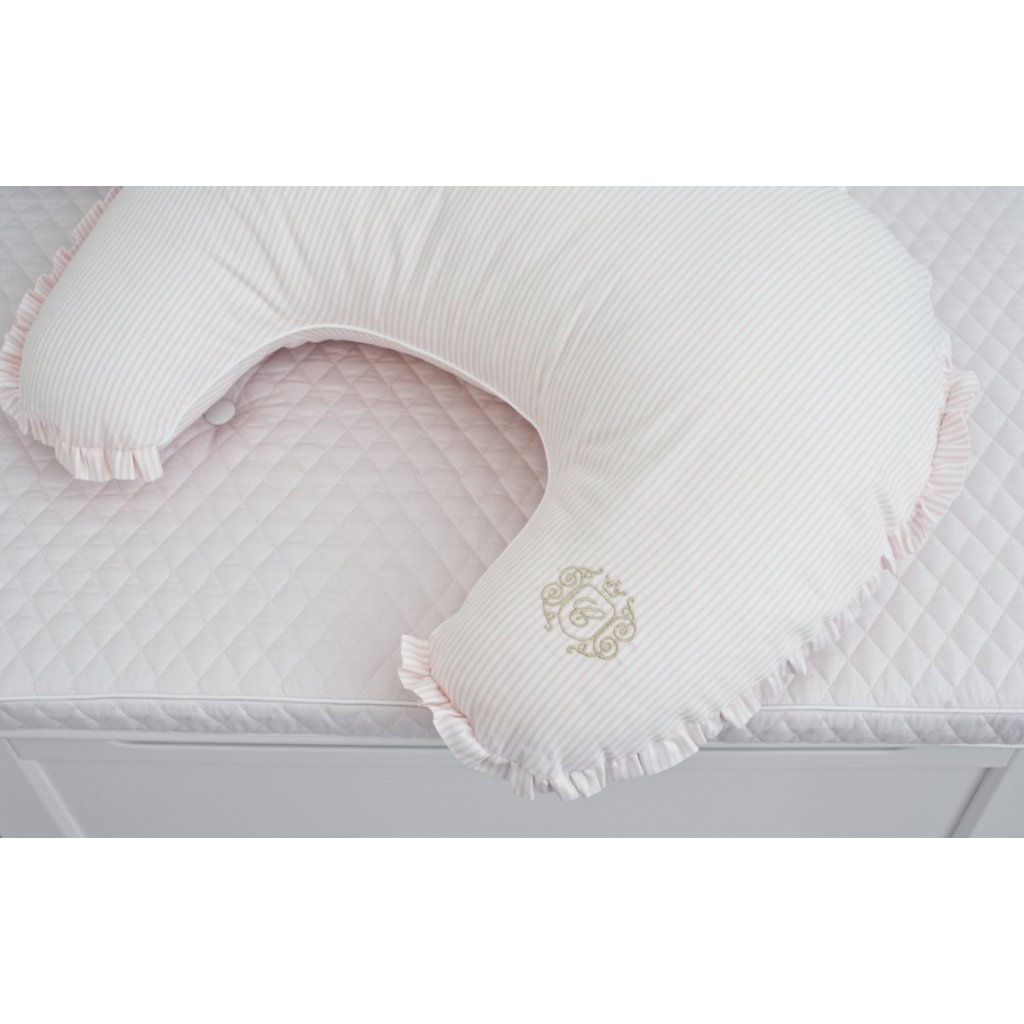 Rozkošný a praktický vankúšik nevyhnutný na kŕmenie vášho dieťatka. Vďaka mäkkej a elastickej výplni drží svoj tvar, dobre poslúži ako detský anatomický vankúšik alebo ozdobný dekoračný vankúšik. Vankúšik je vyrobený z bledoružovej bavlnenej látky a je ozdobený volánikom a zlatým znakom. Snímateľný poťah je prateľný.