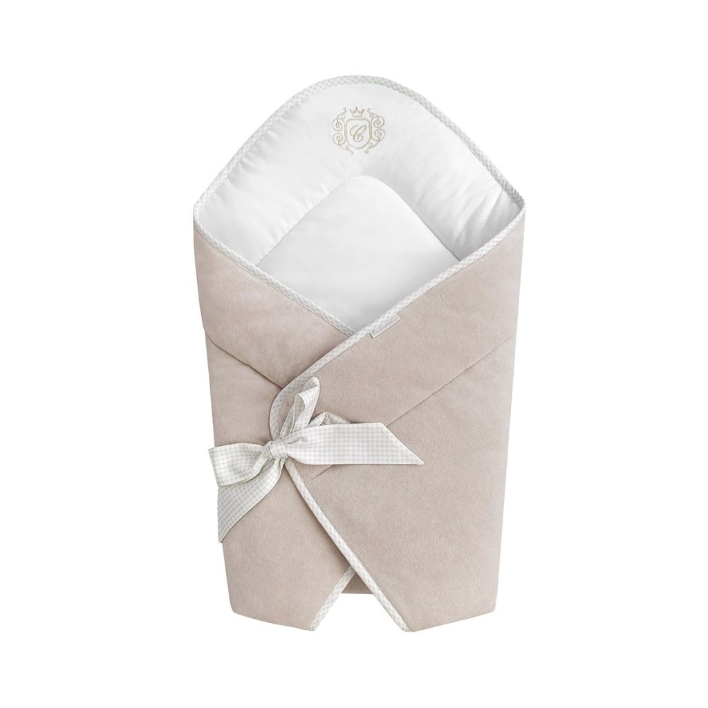 Elegantná zavinovačka v béžovej farbe. Je vyrobená z béžového velúru a vyplnený rúnom, vďaka čomu je veľmi pekná a hrejivá. Zdobené zlatou výšivkou. Používanie je veľmi pohodlné - viazanie na mašľu. Nemá žiadne výstužné prvky a po rozložení bude perfektná aj ako letná prikrývka.
