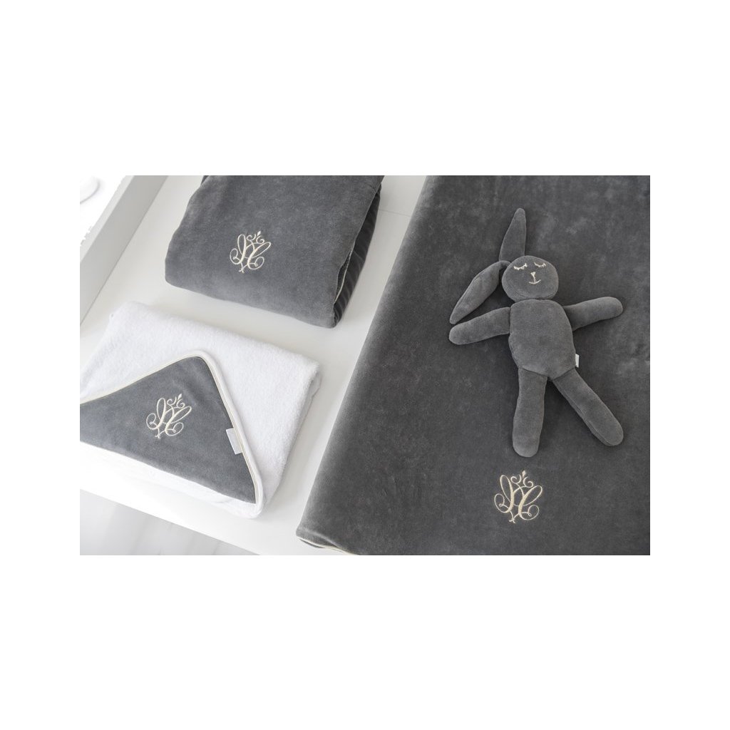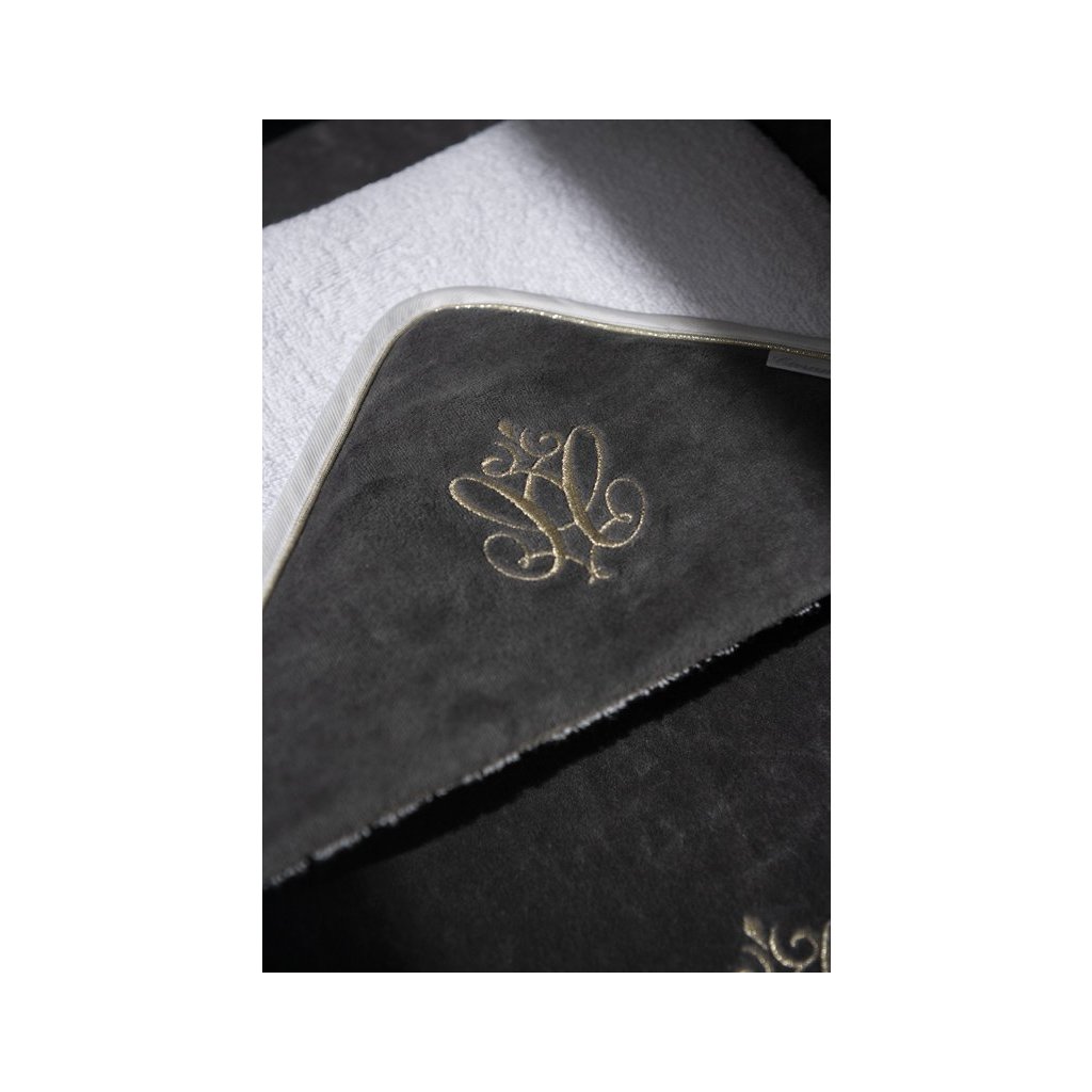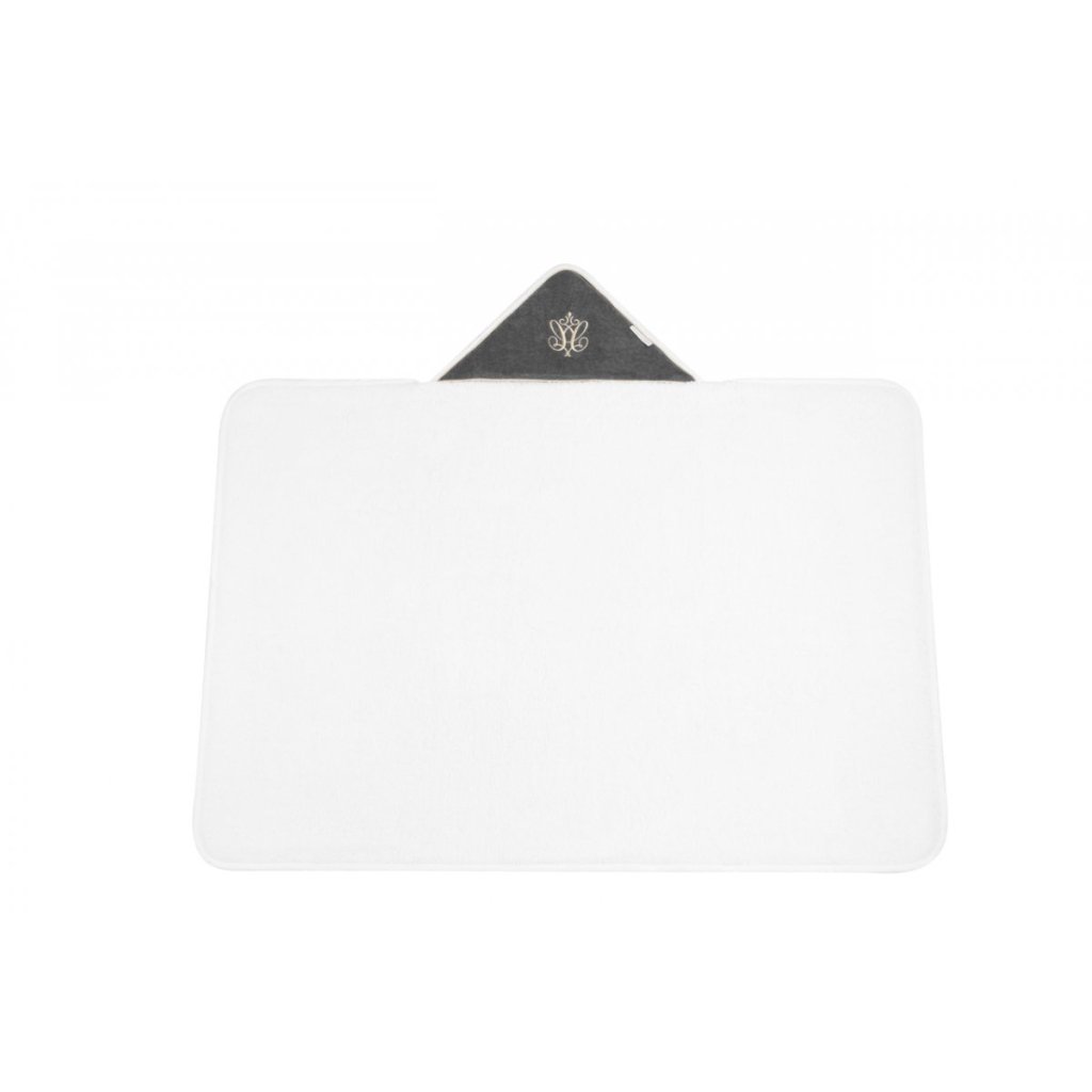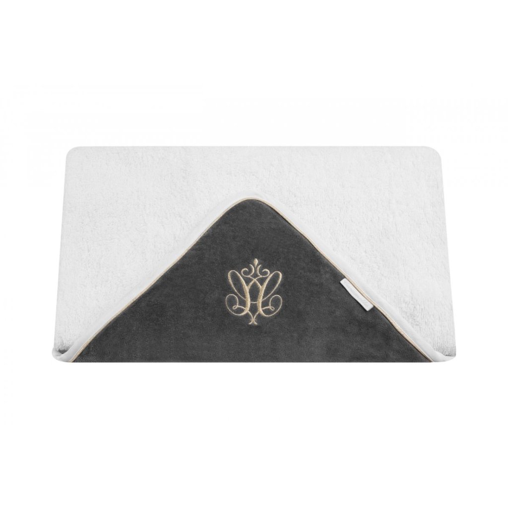 Elegantná osuška vyrobená z bielej froté látky. Antracitová velúrová kapucňa je ozdobená elegantným zlatým znakom. Vhodná pre menšie aj väčšie detičky, nakoľko má väčší rozmer ako bežné osušky. Ideálna ako darček. Možnosť vyšiť meno dieťatka - meno uveďte do poznámky pri vytváraní objednávky.