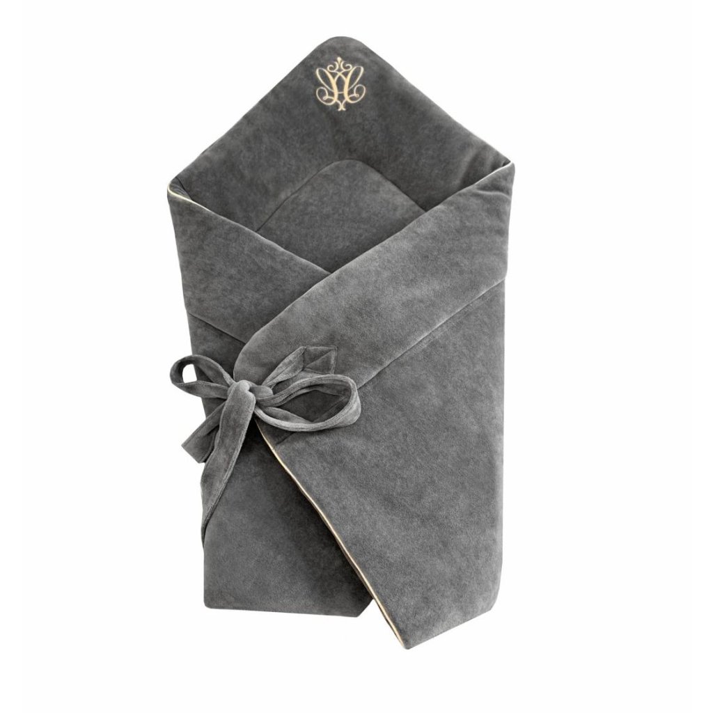 Elegantná zavinovačka v tmavošedej farbe. Je vyrobená z antracitového velúru a vyplnený rúnom, vďaka čomu je veľmi pekná a hrejivá. Zdobená zlatou firemnou výšivkou. Používanie je veľmi pohodlné - viazanie na mašľu. Nemá žiadne výstužné prvky a po rozložení bude perfektná aj ako letná prikrývka.