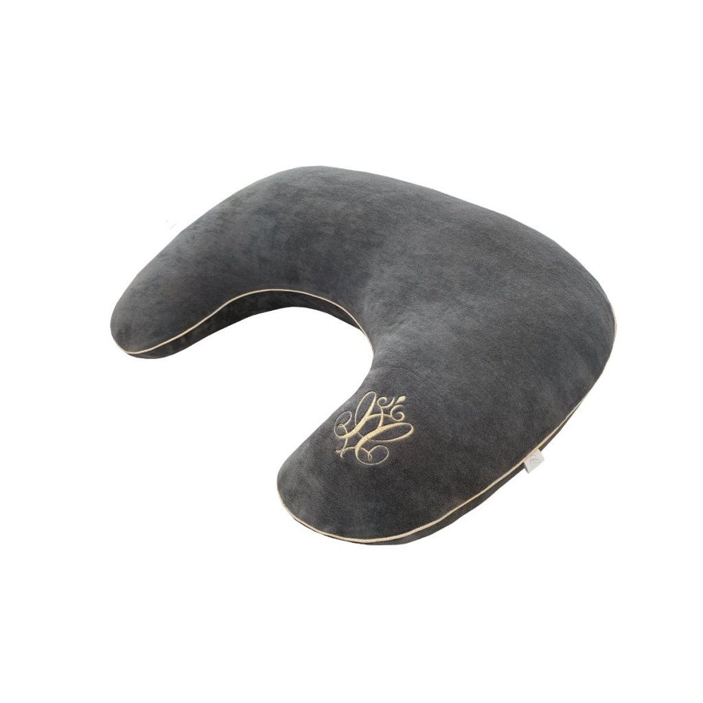 Rozkošný a praktický vankúšik nevyhnutný na kŕmenie vášho dieťatka. Vďaka mäkkej a elastickej výplni drží svoj tvar, dobre poslúži ako detský anatomický vankúšik alebo ozdobný dekoračný vankúšik. Vyrobené z antracitového velúru, zakončené zlatým znakom. Snímateľný poťah je prateľný.