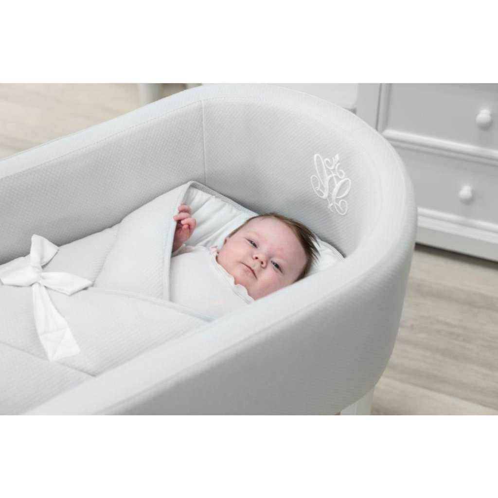 Elegantná kolíska čalúnená prešívaným velúrom v modrej farbe a zdobená trojrozmernou výšivkou. Tento útulný kus nábytku poskytuje dieťaťu jemné hojdanie, a tým aj pokojný spánok.