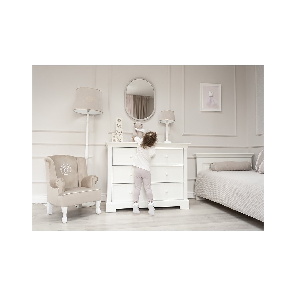 Elegantné, štylizované mini kreslo potiahnuté kvalitným umývateľným textilom v bledoružovej farbe. Dostupné vo viacerých farbách: bledoružová, modrá a béžová
