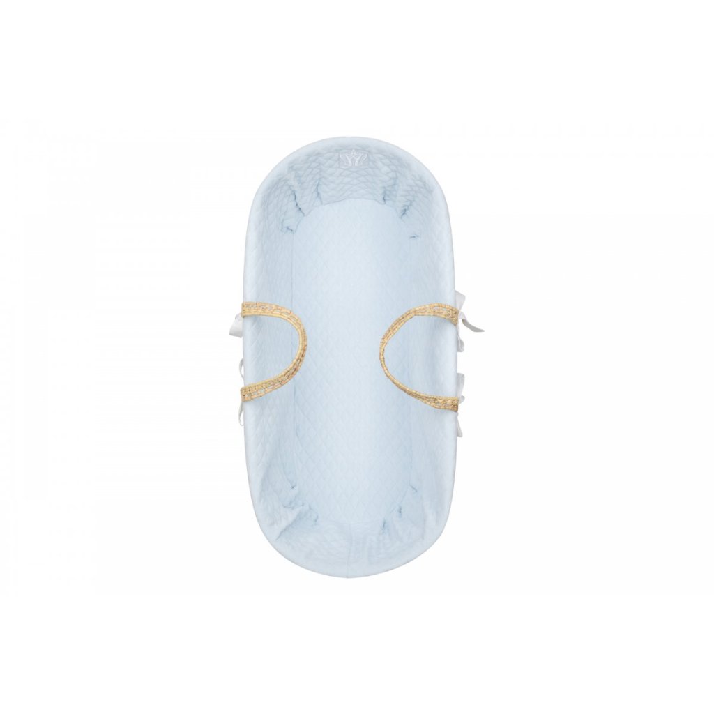 Rozkošný kôš Mojžiš vyrobený z palmových listov bezpečný pre dieťa. Má prešívanú bavlnenú textilnú podšívku v modrej farbe (zaväzuje sa malými ramienkami) a v spodnej časti má oválny piškótový matrac.