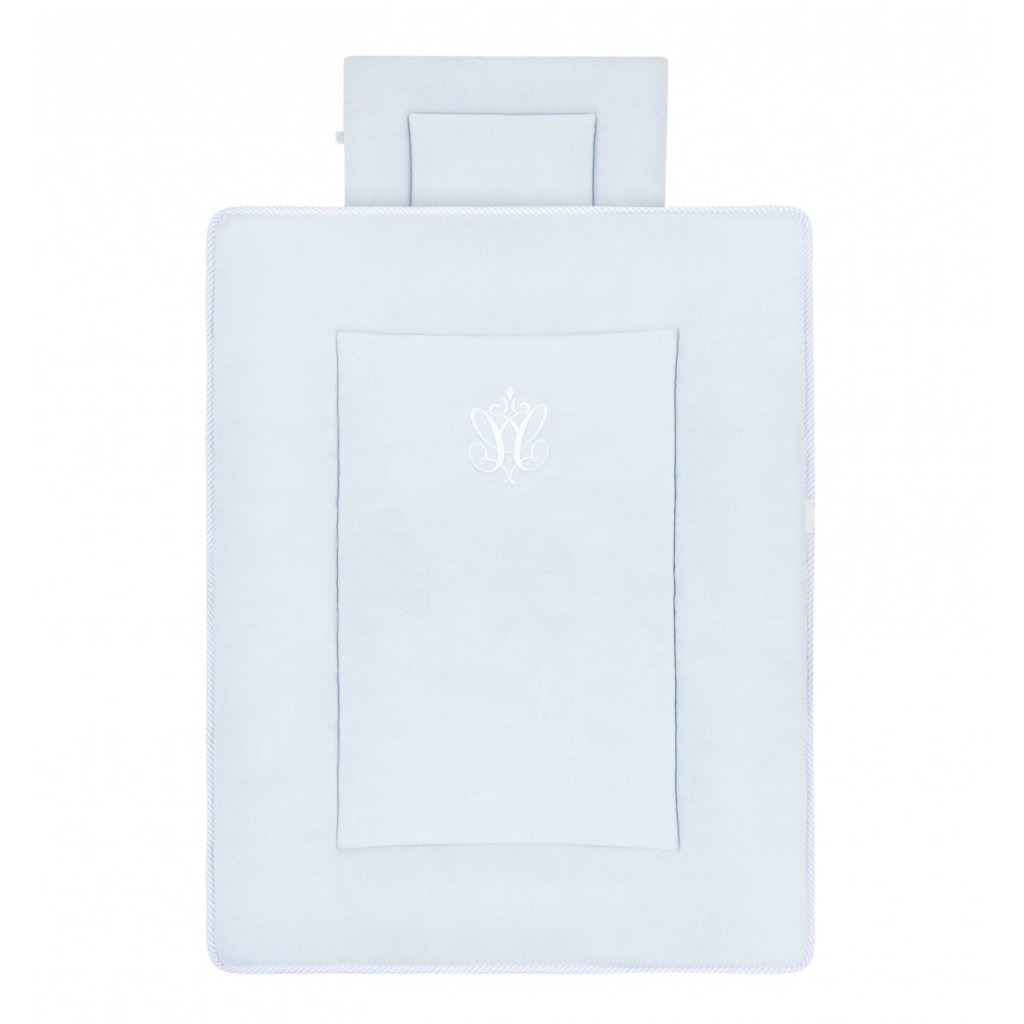 Prvé obliečky pre malé bábätko, už s výplňou. Sada obsahuje paplón a vankúšik. Je ozdobená elegantným znakom.