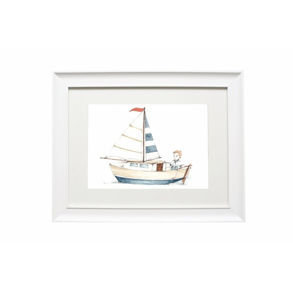 Krásny obrázok chlapca v člne.Pevný elegantný rám je vyrobený z dreva.