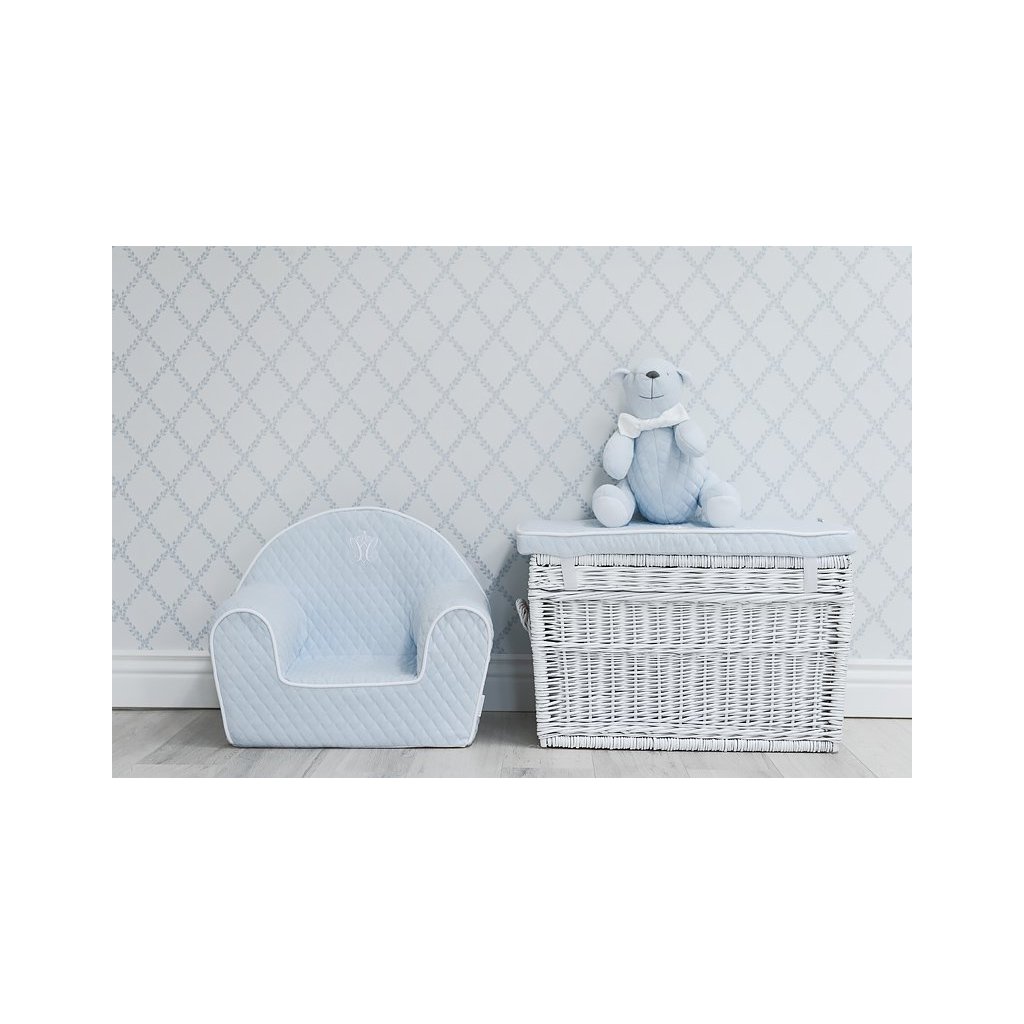 Krásny odkladací košík z bledomodrého prešívaného velúru zdobený elegantnou výšivkou. Ideálne miesto na uloženie hračiek, plienok alebo iných doplnkov pre deti.