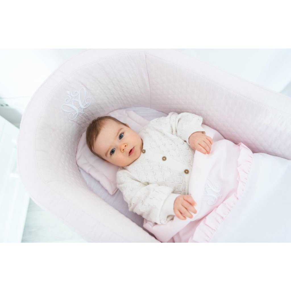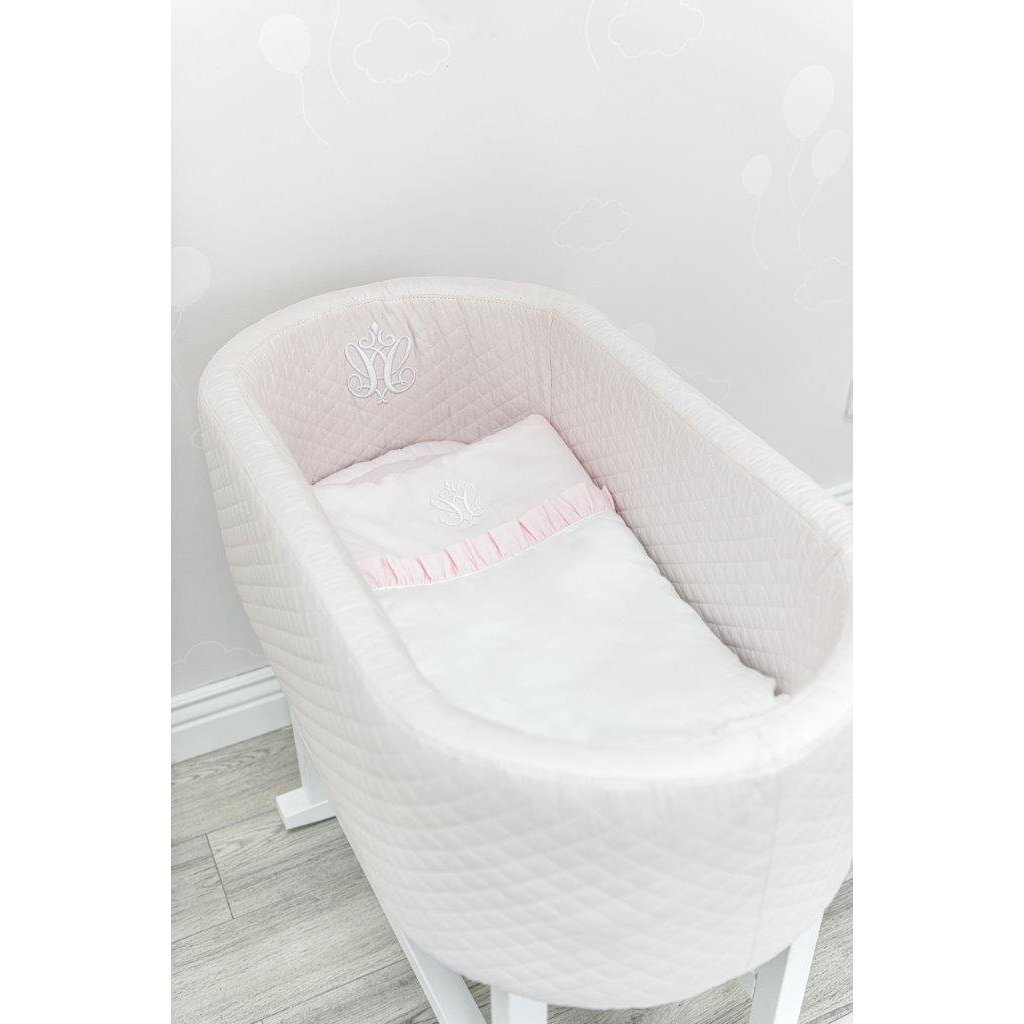 Elegantná kolíska čalúnená ružovou prešívanou látkou a zdobená trojrozmernou výšivkou. Tento útulný kus nábytku poskytuje dieťaťu jemné hojdanie, a tým aj pokojný spánok. K tejto kolíske odporúčame dokúpiť si Baby Pink mini obliečky s výplňou 60x60cm ružové (kód 40029).