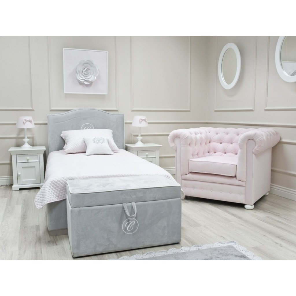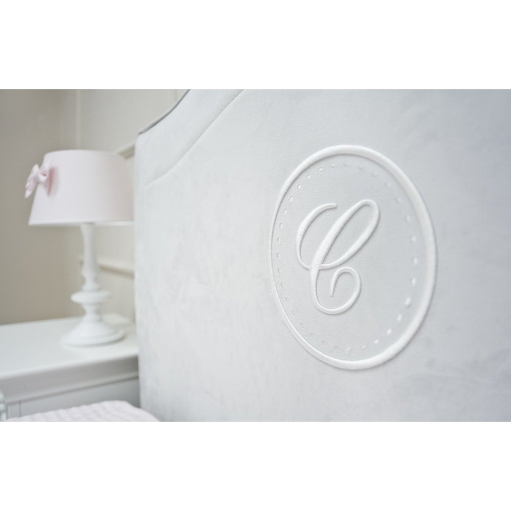 Elegantná detská posteľ s exkluzívnou výšivkou s písmenom „C“. Čelo postele a rám sú čalúnené kvalitnou umývateľnou textíliou vo farbe ružová, vďaka čomu je nábytok ešte funkčnejší.