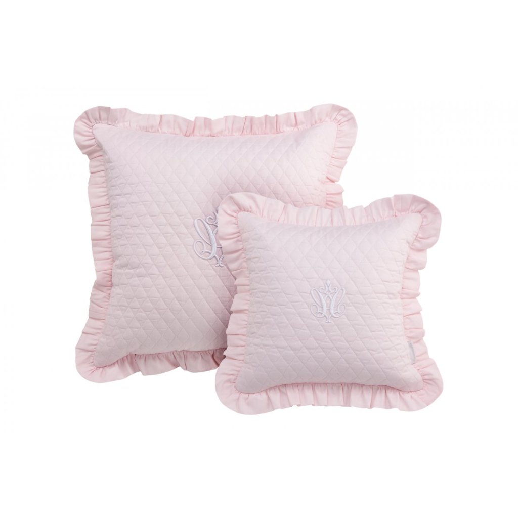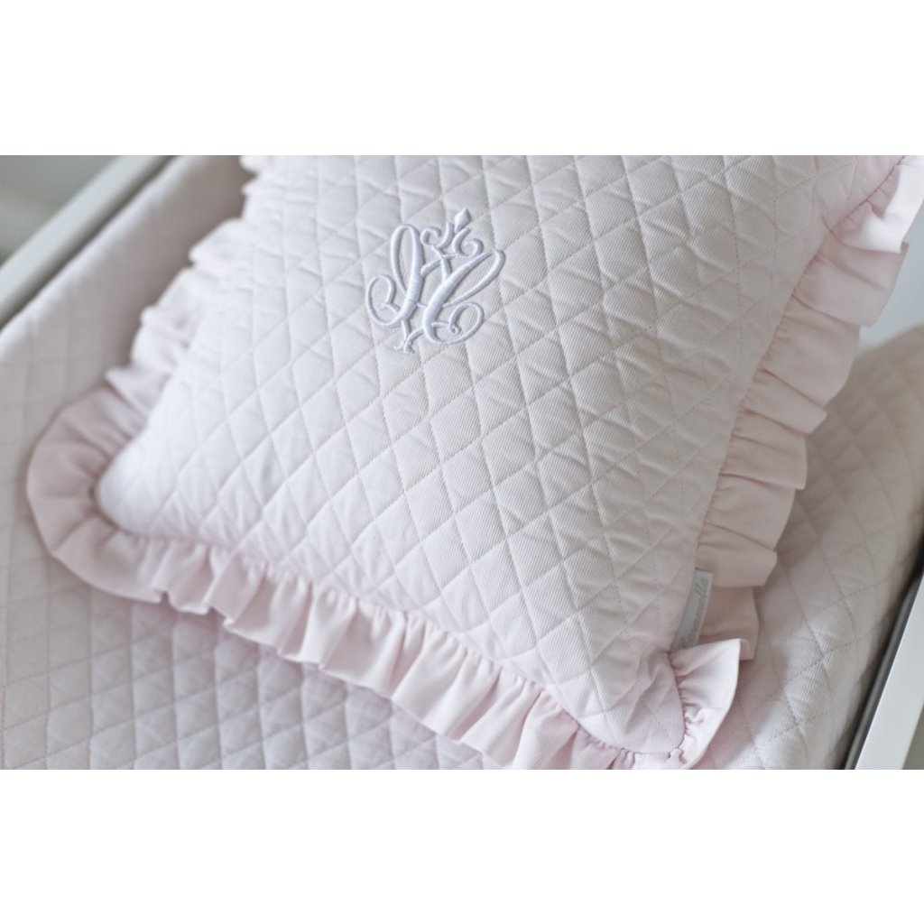 Krásny prešívaný vankúšik v jemnej ružovej farbe, zakončený bielym čalúneným lemom a ozdobený elegantnou výšivkou s menom Vášho dieťatka. Zapína sa vzadu na zips. Dostupné v...