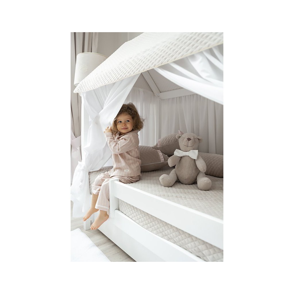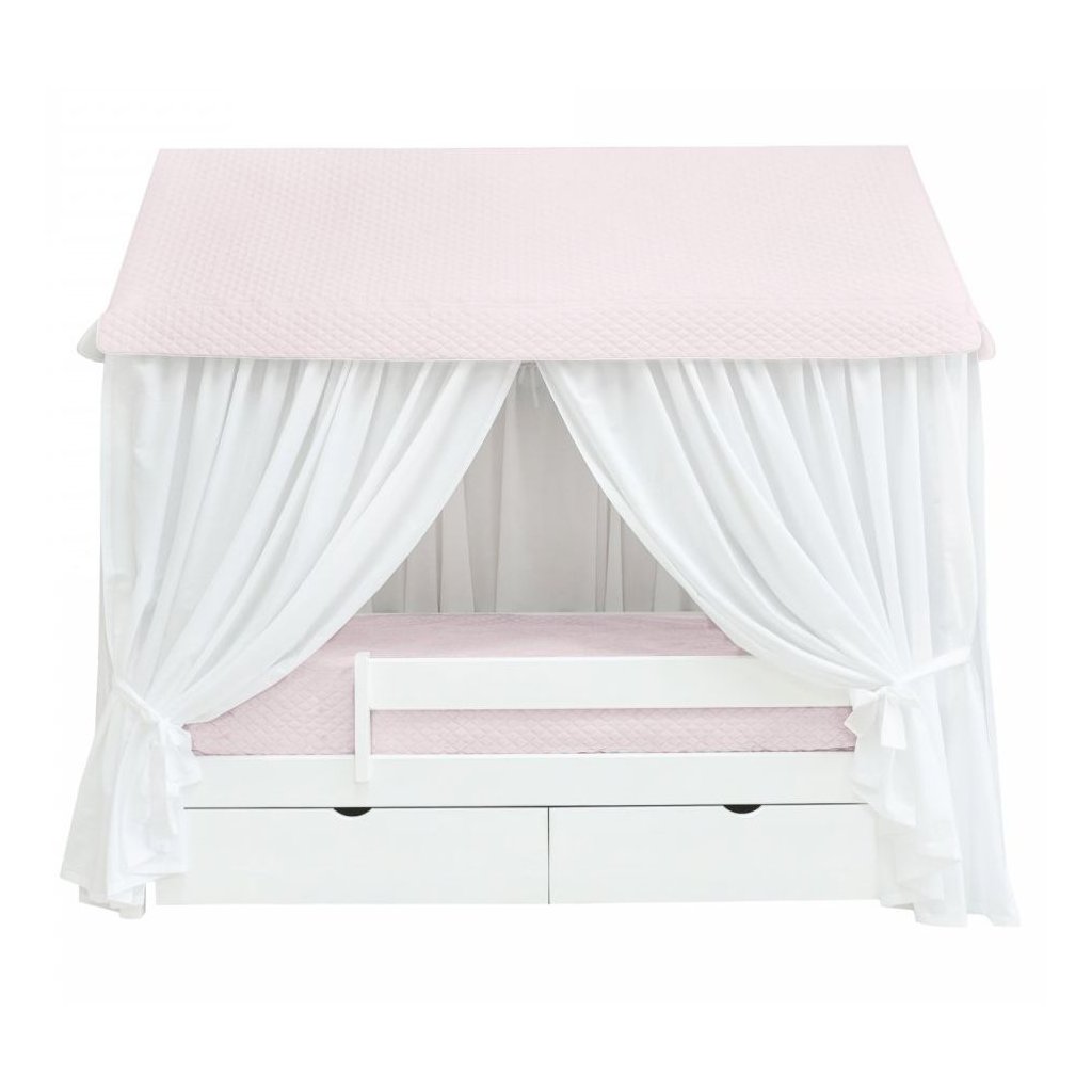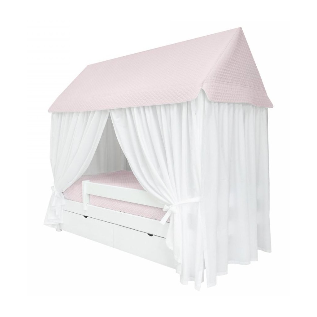 Úžasná posteľ v tvare domčeka. Posteľ vytvorí v izbe jedinečnú atmosféru. Strieška je vyrobená z ružového prešívaného bavlneného materiálu a „steny“ sú vyrobené z jemného bieleho textilu, zdobeného dvoma očarujúcimi mašličkami. Rozmer matraca 160 x 80 cm.