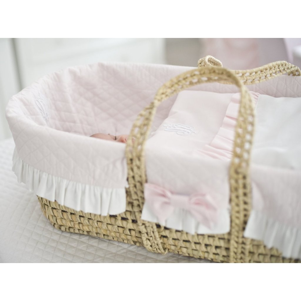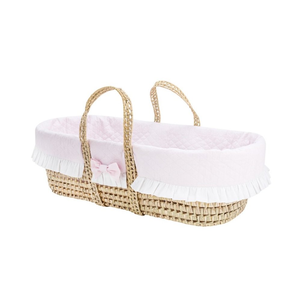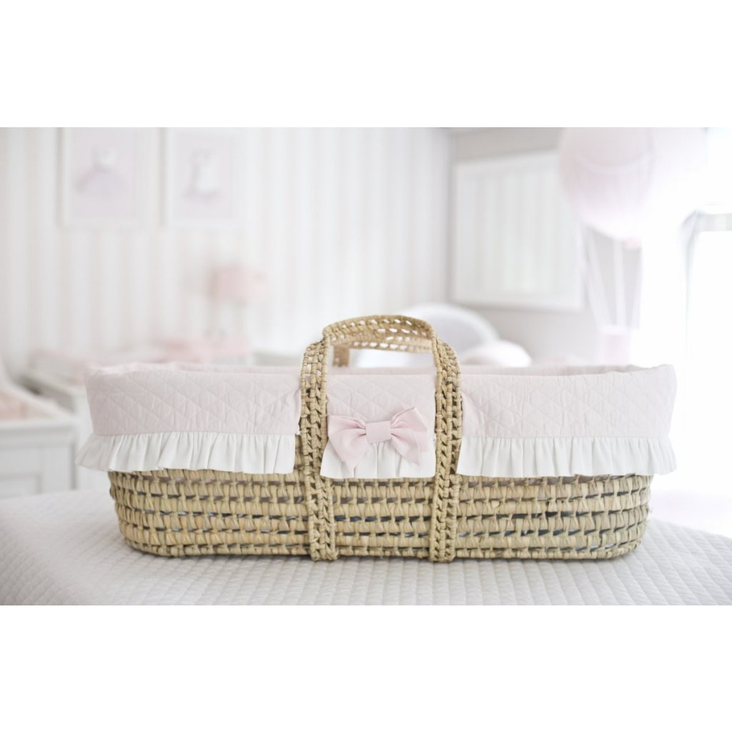 Rozkošný kôš Mojžiš vyrobený z palmových listov bezpečný pre dieťa. Má prešívanú bavlnenú textilnú podšívku v baby ružovej farbe (zaväzuje sa malými ramienkami) a v spodnej časti má oválny piškótový matrac.