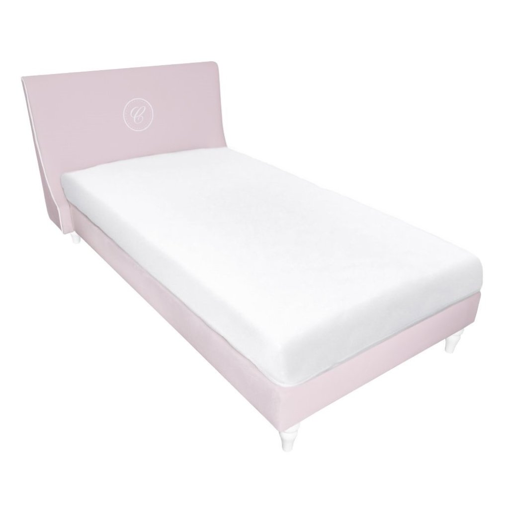 Elegantná detská posteľ s exkluzívnou výšivkou s písmenom „C“.Čelo postele a rám sú čalúnené kvalitnou umývateľnou textíliou v baby ružovej farbe, vďaka čomu je nábytok ešte funkčnejší.Čelo postele má dekoratívnu stranu a konštrukcia na nohách dodáva posteli ľahký vzhľad.Posteľ si môžete objednať v rôznych veľkostiach a farbách.