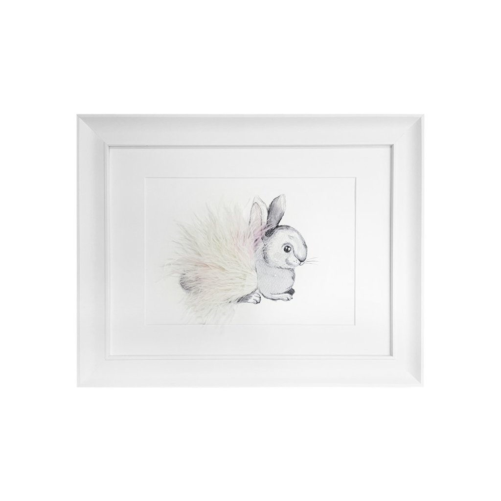 Krásny trojrozmerný textilný obrázok s motívom zajačik, dotvorený prírodnými pierkami. Zvýraznený dreveným bielym rámom.