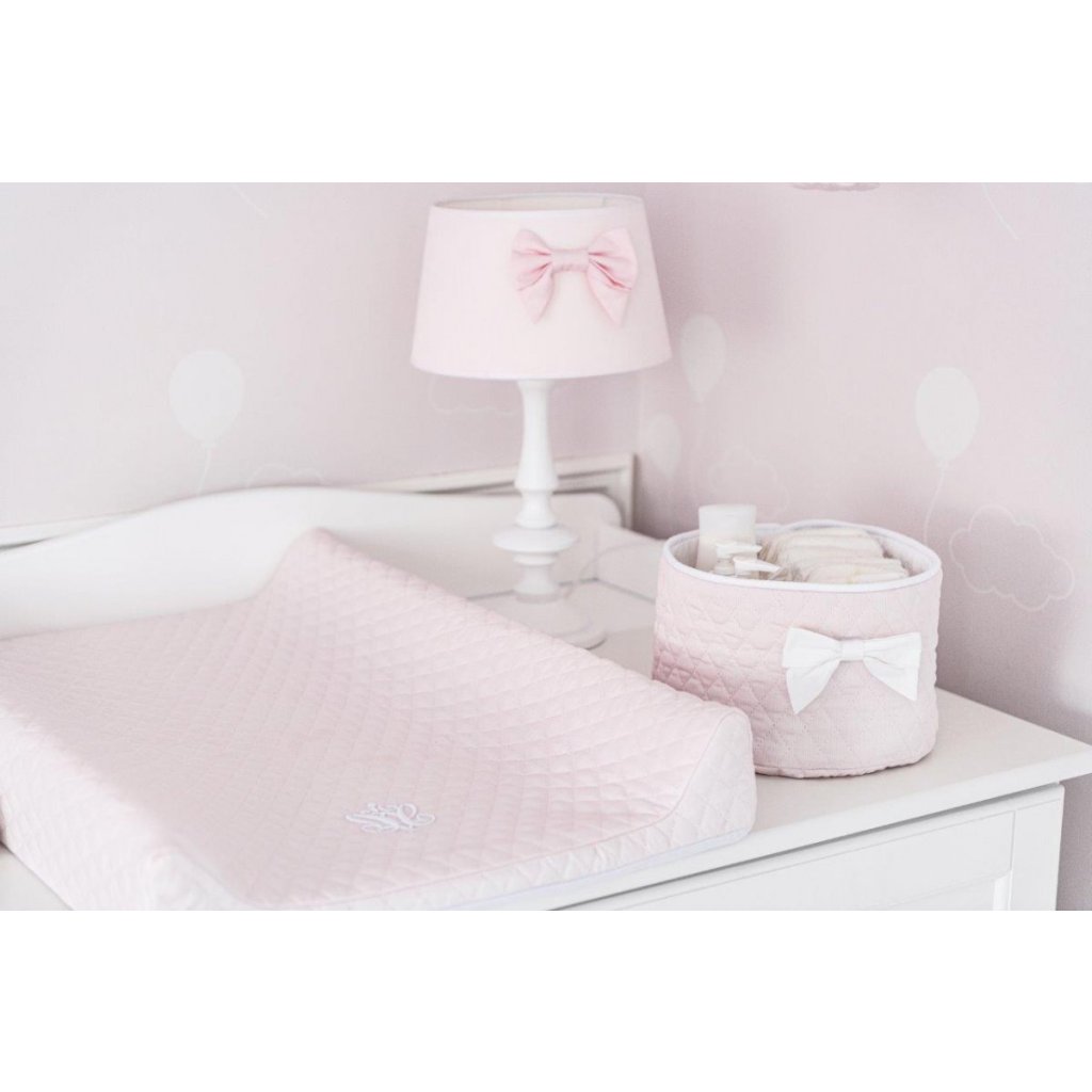 Krásny odkladací košík z bledoružového prešívaného velúru zdobený elegantnou výšivkou. Ideálne miesto na uloženie hračiek, plienok alebo iných doplnkov pre deti. Košík je vystužený - vyplnený mäkkou špongiou.