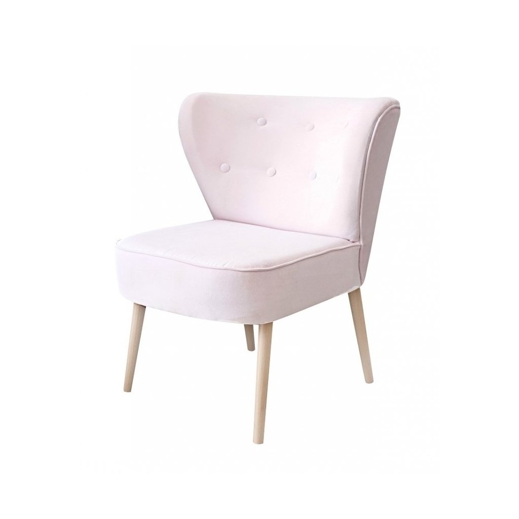 Krásna a štýlová stolička v retro štýle vyrobená z kvalitného prateľného zamatového textilu v ružovom odtieni. Nohy sú matné a vyrobené z bukového dreva. Operadlo kresla je zdobené jemným prešívaním a gombíkmi. Tento nábytok dokonale vyzerá v interiéroch v škandinávskom štýle až po tie moderné.