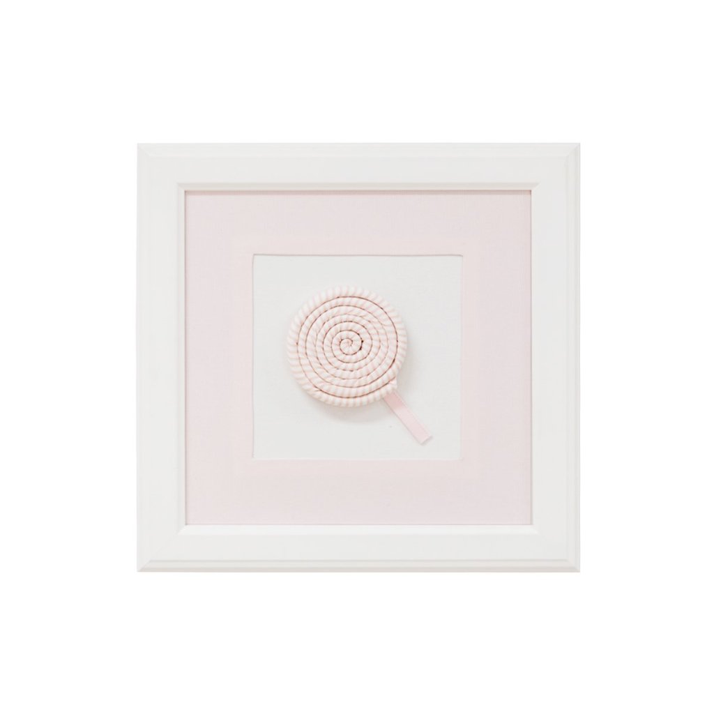 Rozkošné trojrozmerné lízatko v baby ružovej a bielej farbe. Vnútorná časť obrazu je vyrobená z textilu. Pasparta je vyrobená z textilu baby pink.