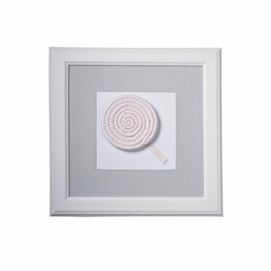 Rozkošná trojrozmerná lízanka v detských ružových a sivých farbách. Vnútorná časť obrázka je vyrobená z textilu.