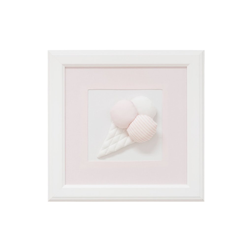 Rozkošná trojrozmerná zmrzlina v detskej ružovej a bielej farbe. Vnútorná časť obrazu je vyrobená z textilu. Pasparta je vyrobená z textilu baby pink.