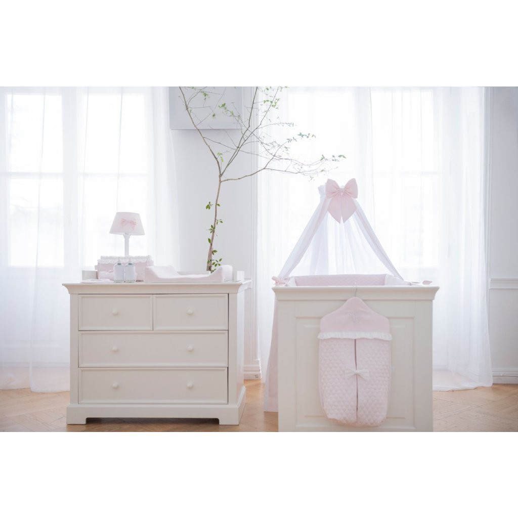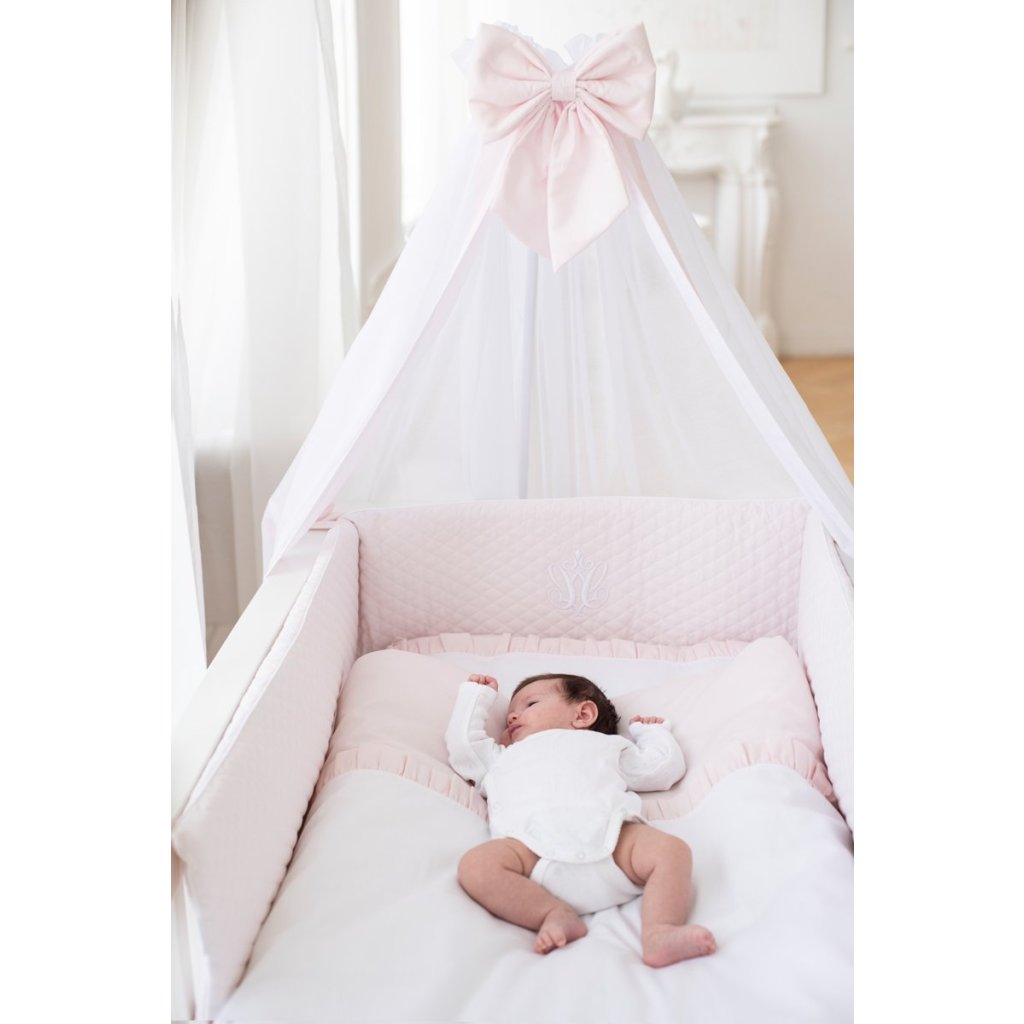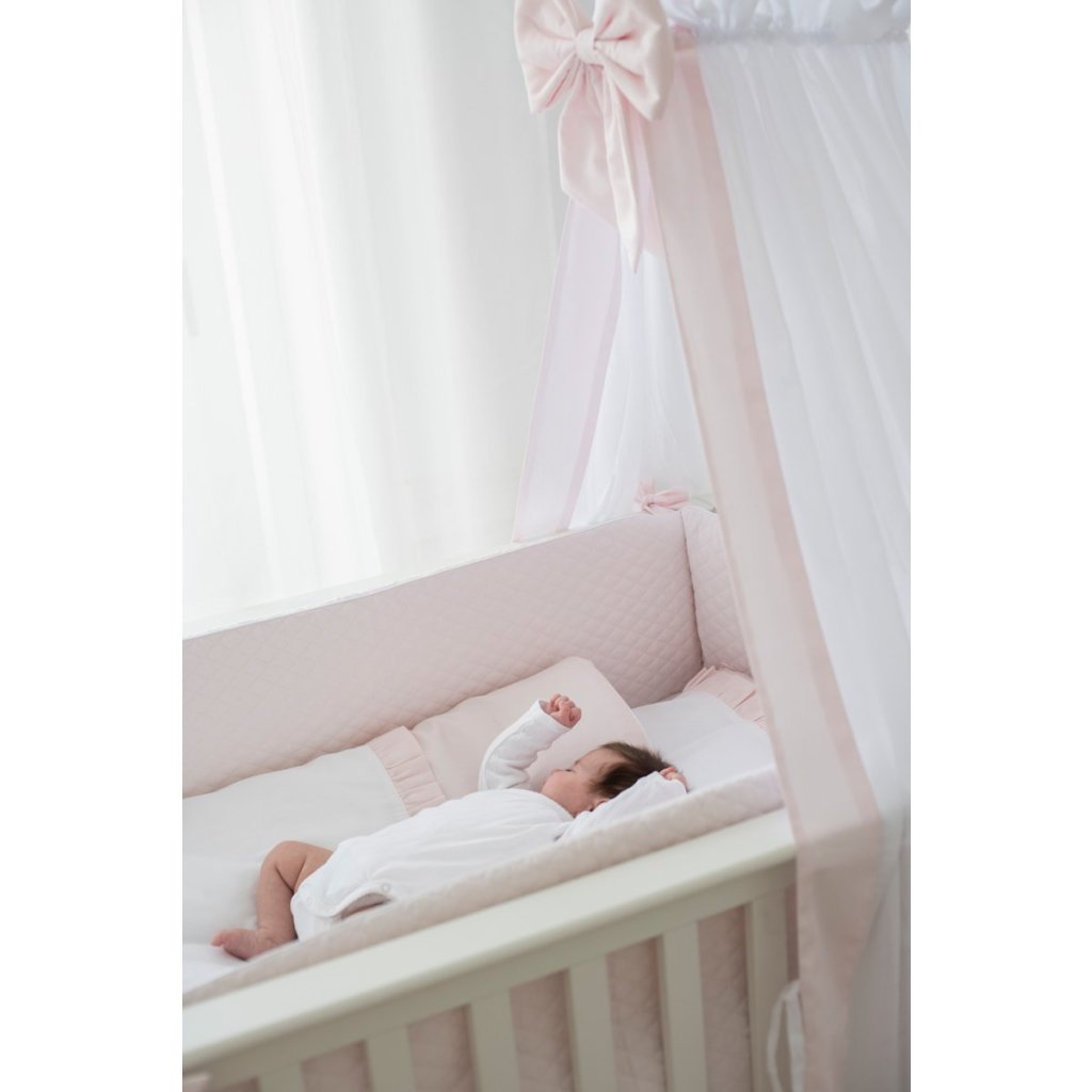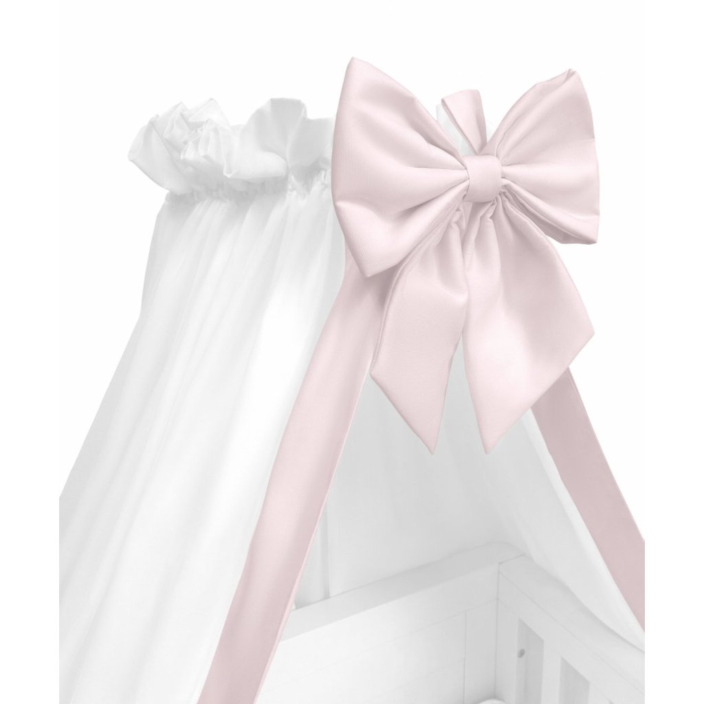 Caramella baldachýn nad detskú postieľku s ružovou mašľou