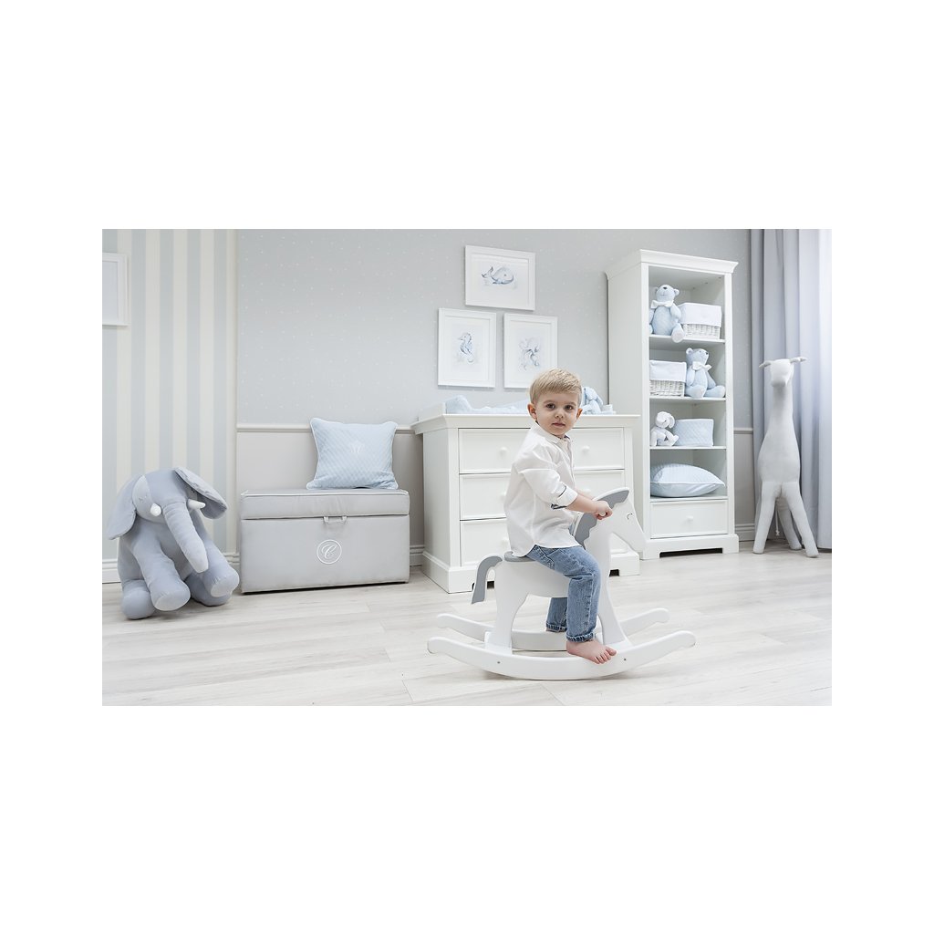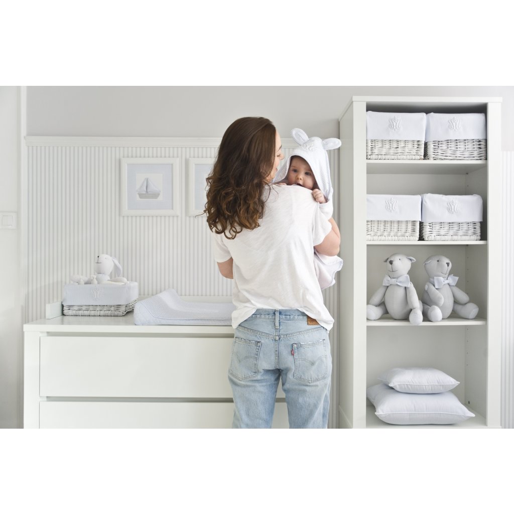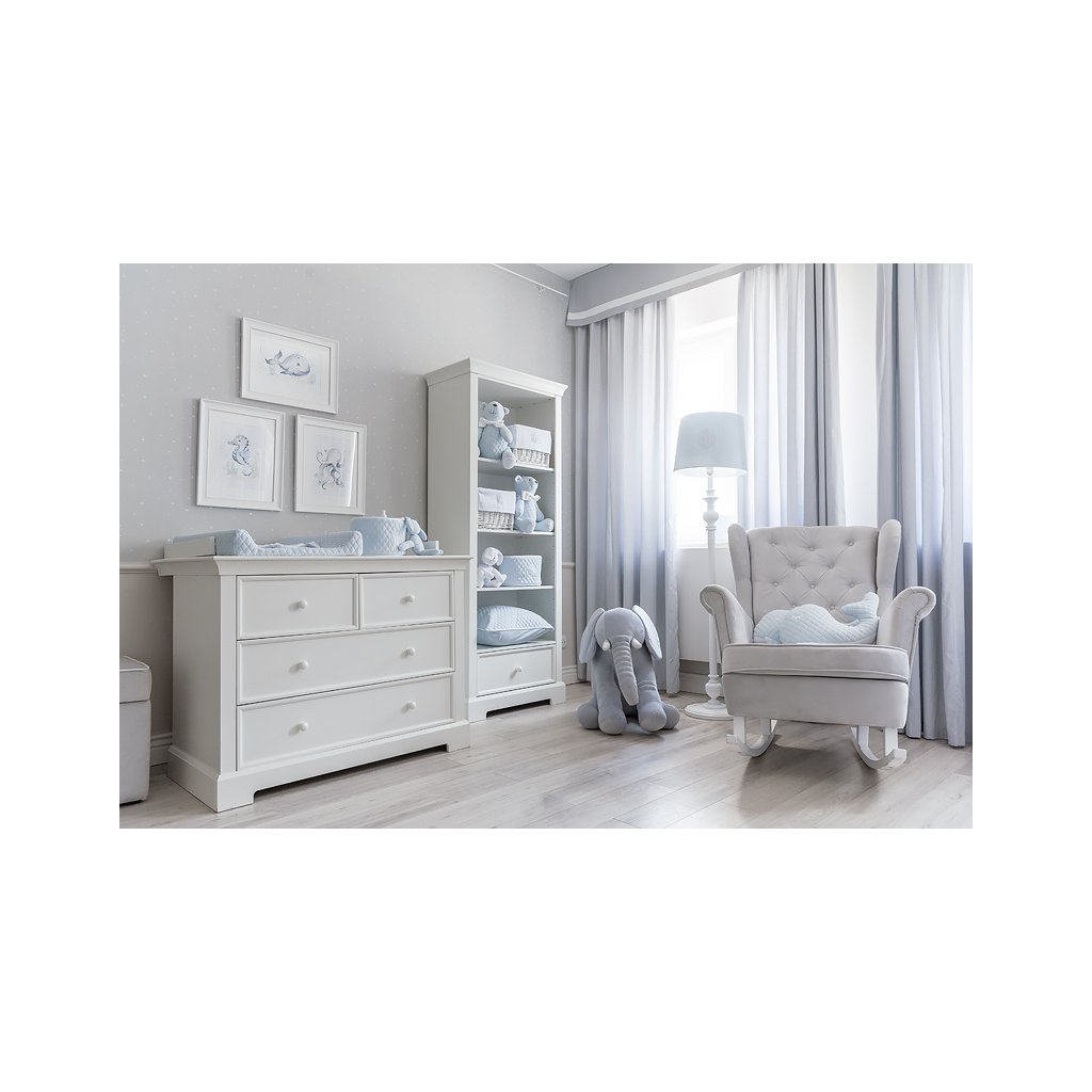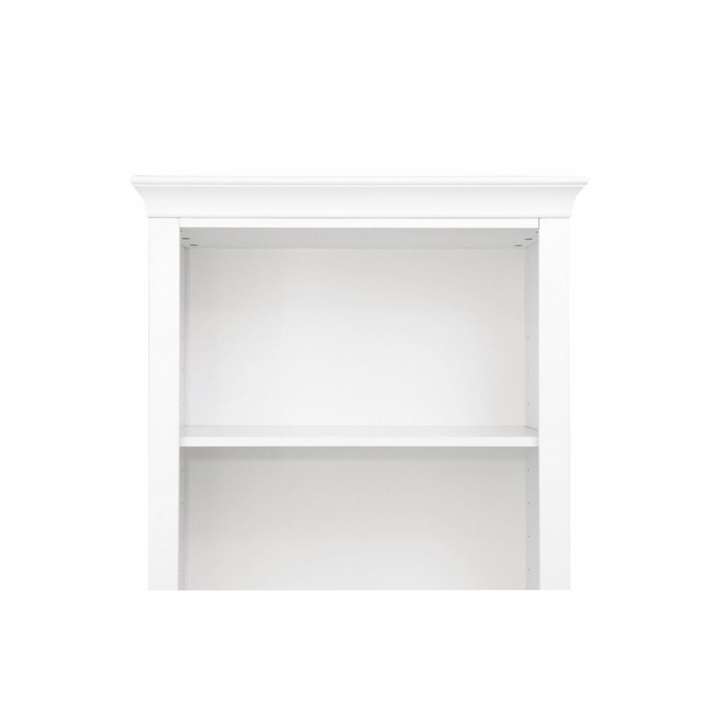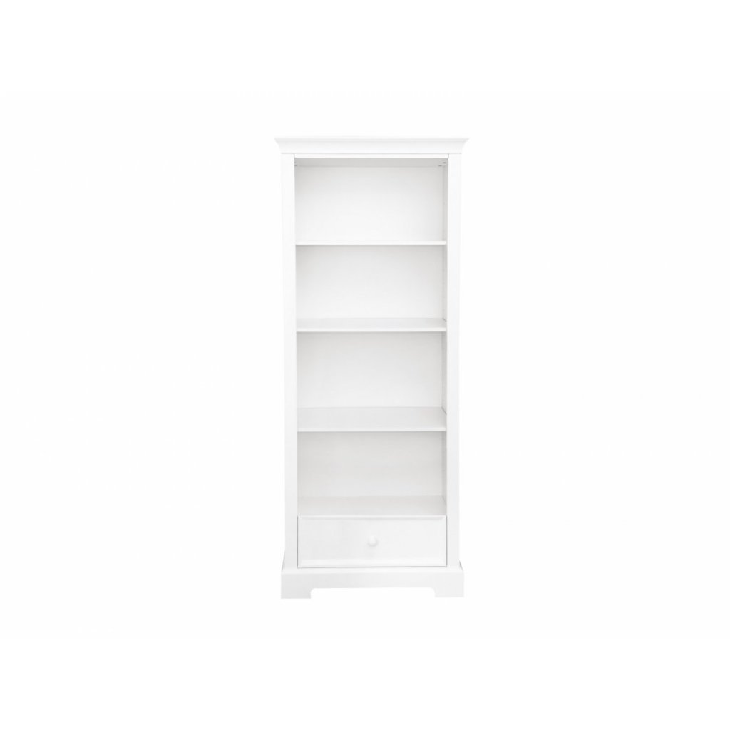 Očarujúca biela knižnica krásne zakončená ozdobným soklom a vybavená praktickou zásuvkou. Kus nábytku, ktorý je potrebný v každej detskej izbe. Priestranné police poskytujú dostatok miesta na všetky potrebné vecičky pre bábätko, hračky a iné doplnky. Odporúčame si dokúpiť praktické košíky.