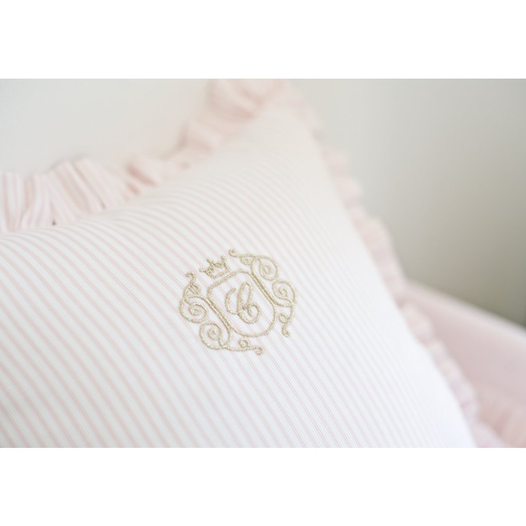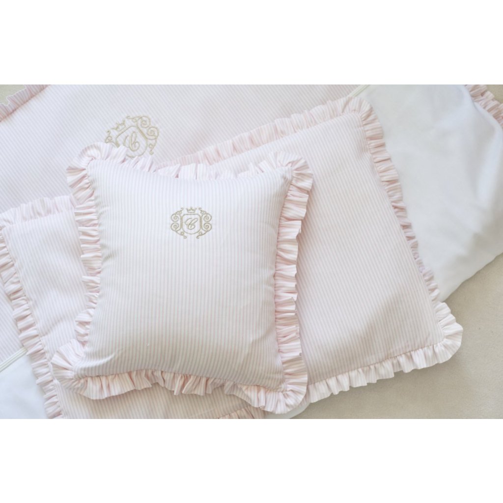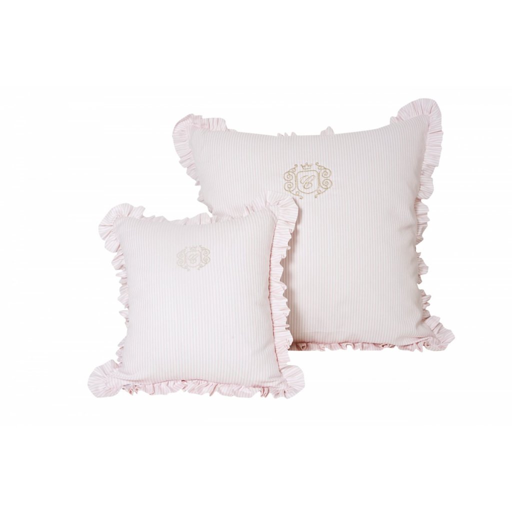 Ružové vankúše zdobené krásnym volánom a elegantným zlatým emblémom. Vyrobené z kvalitnej bavlny s ružovo-bielymi pásikmi. Budú skvelou dekoráciou v dievčenskej izbičke. Dostupné v dvoch veľkostiach. Súčasťou vankúšika je obliečka na vankúš s výplňou.