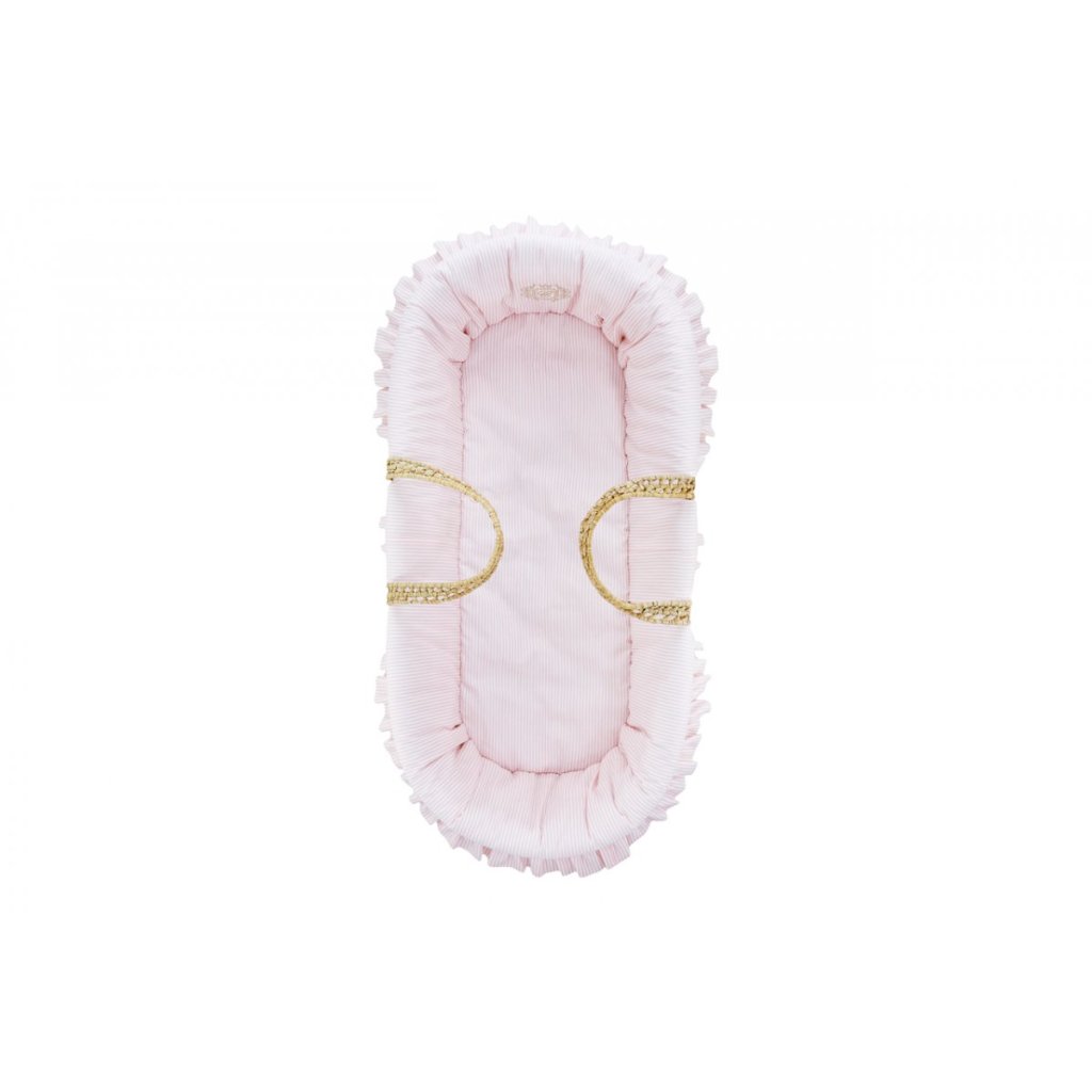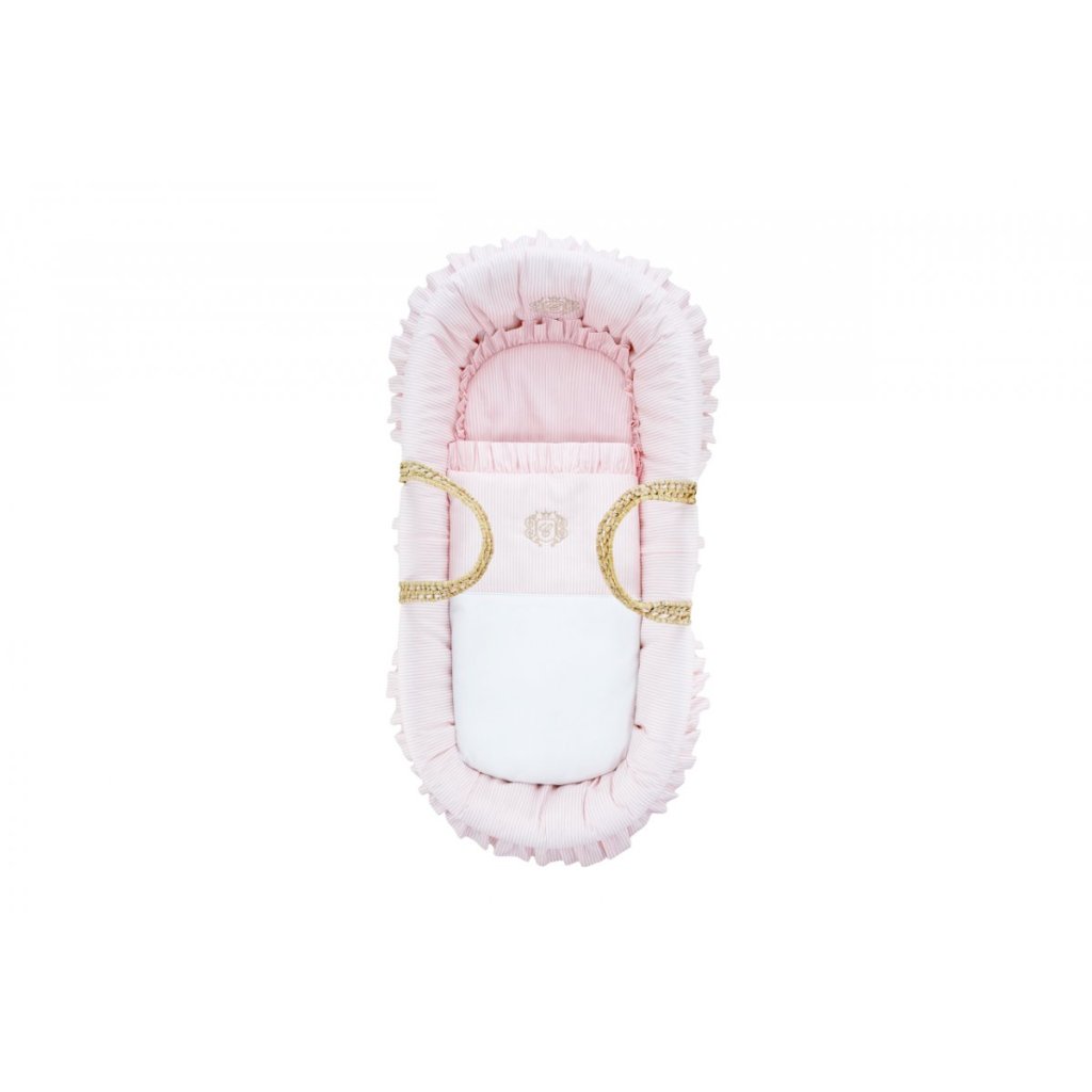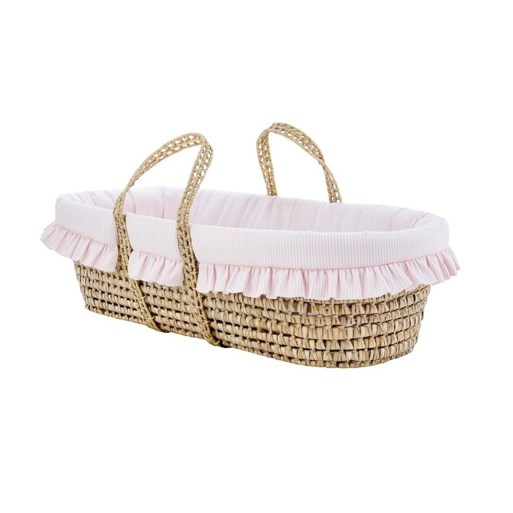 Rozkošný kôš Mojžiš vyrobený z palmových listov bezpečný pre dieťa. Má podšívku z bavlneného textilu s bielymi a baby ružovými ramienkami a oválny piškótový matrac.