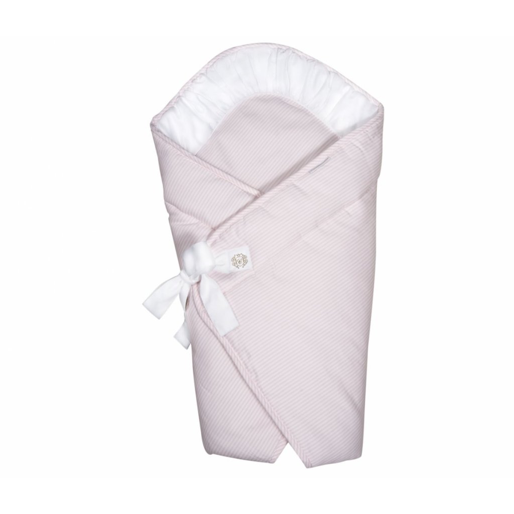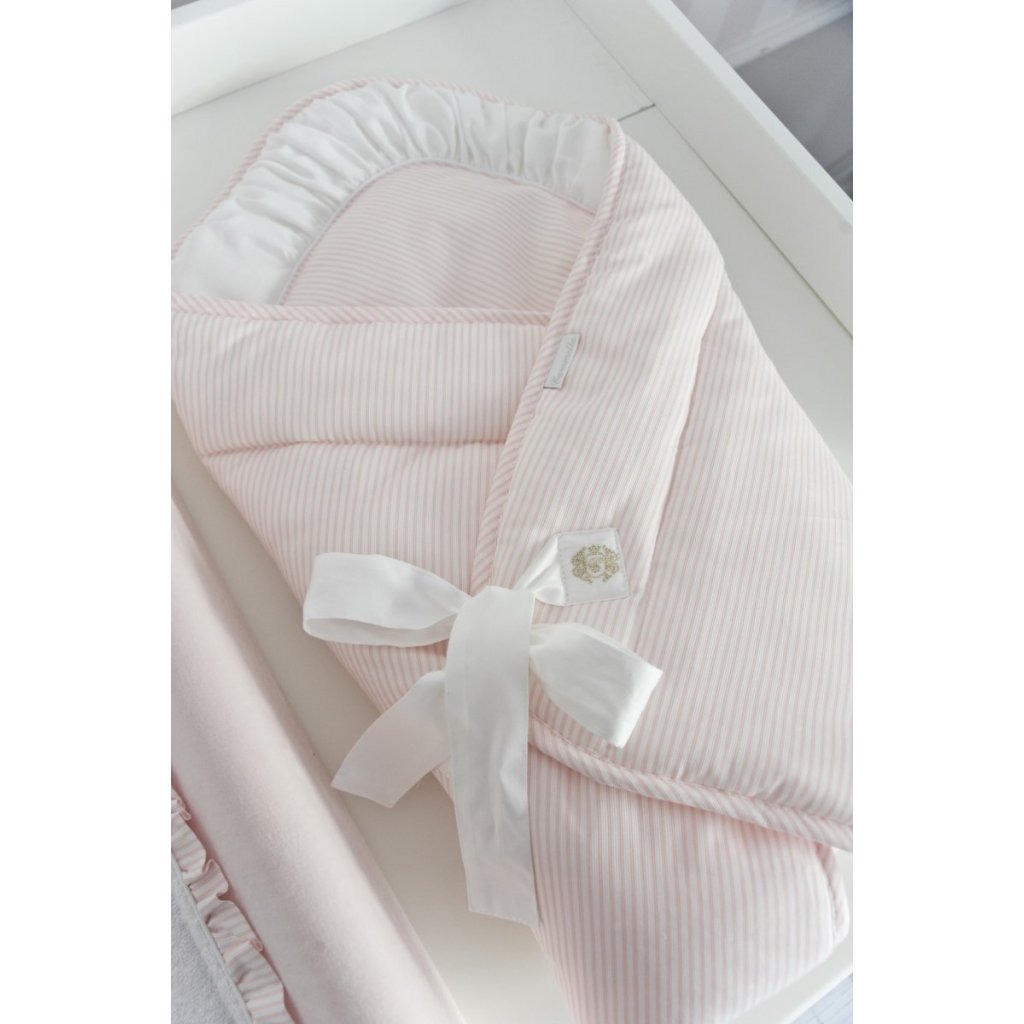 Elegantná zavinovačka v bielej a ružovej farbe vyrobená z pruhovaného textilu s bielymi záhybmi, zdobený bielou mašličkou s malým znakom Golden Chic. Vnútorná časť je vyplnená netkanou textíliou, vďaka čomu je veľmi teplá a útulná. Používanie je veľmi pohodlné - viazanie na mašľu. Nemá žiadne vystužené prvky a po rozložení bude perfektná aj ako letná prikrývka.