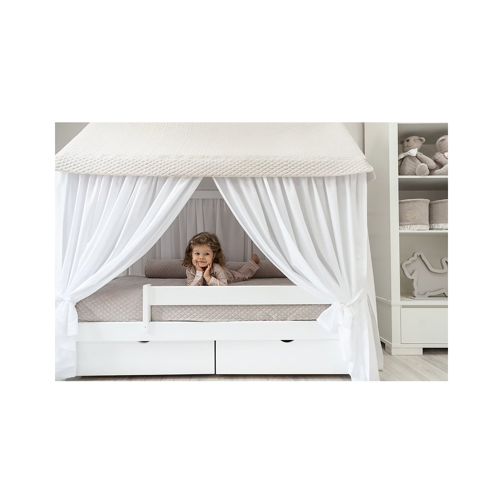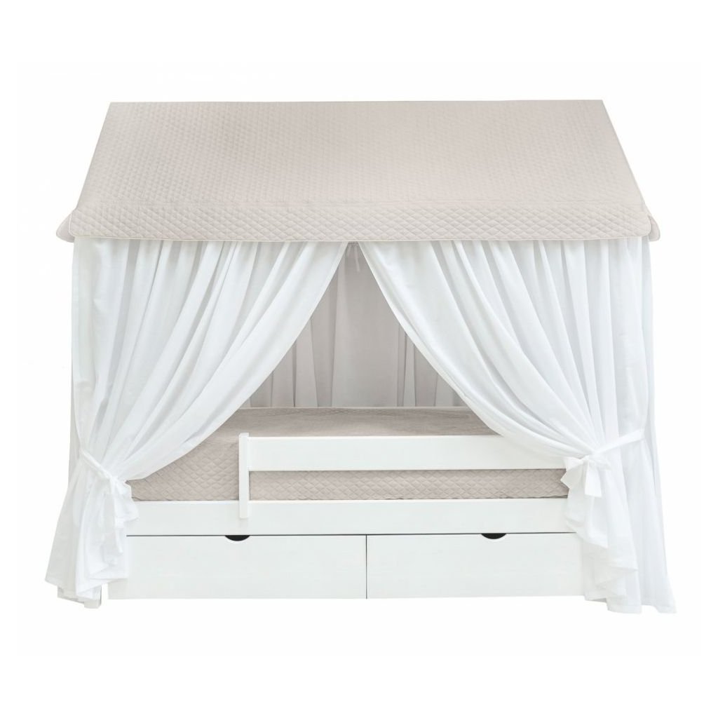 Úžasná posteľ v tvare domčeka. Posteľ vytvorí v izbe jedinečnú atmosféru. Strieška je vyrobená z béžového prešívaného bavlneného materiálu a „steny“ sú vyrobené z jemného bieleho textilu, zdobeného dvoma očarujúcimi mašličkami. Rozmer matraca 160 x 80 cm.
