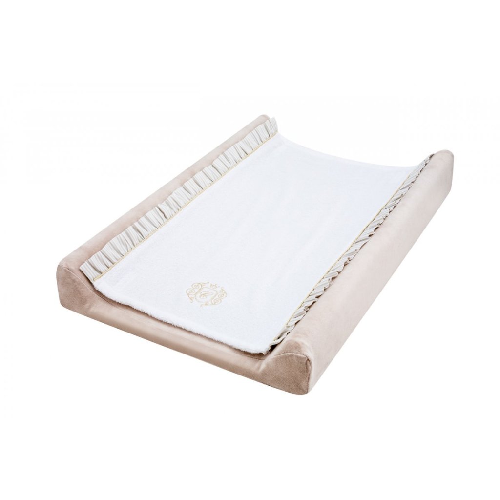 Náhradný poťah na prekrytie prebaľovacej podložky. Vyrobený z bielej froté bavlny so zlatým znakom, rozkošným riasením v béžovej farbe so zlatým lemom.