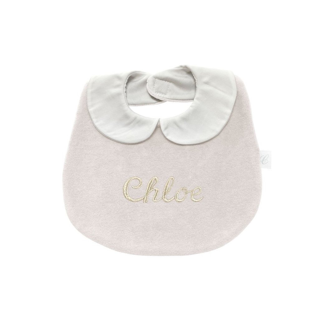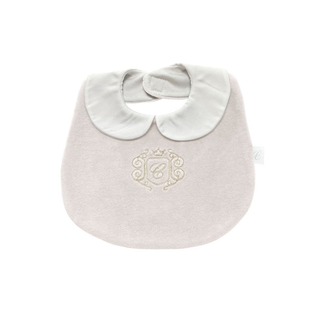 Praktický detský podbradník z jemného béžového velúru, ktorý sa bude páčiť každému malému bábätku. Zapínaná poistka na suchý zips, zdobená bebe golierom a zlatým znakom.