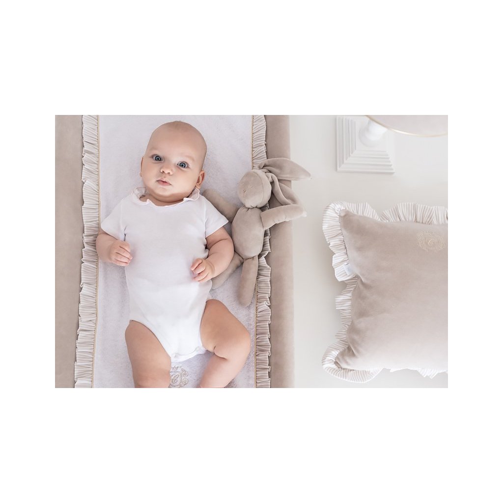 Vystužená elegantná prebaľovacia podložka mimoriadne pohodlná na prebaľovanie vášho bábätka vďaka vysoko kvalitným a jemným materiálom, pričom kombinuje funkčnosť s estetikou. Poduška je pokrytá snímateľným poťahom z béžového velúru s dodatočnou podložkou z froté látky zdobenej zlatým firemným znakom a volánom s bielymi a béžovými pruhmi. Zvýšené okraje chránia dieťa pred úrazom. Certifikovaná prebaľovacia podložka bez škodlivých chemikálií, vyrobená z umývateľného PVC, pričom vnútro tvorí mäkká špongia.