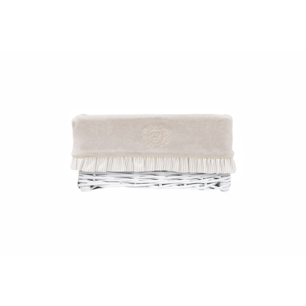 Elegantný prútený košík s béžovým velúrovým poťahom, zdobený elegantnou zlatou výšivkou a očarujúcim volánom. Ideálne miesto na uloženie hračiek, plienok alebo iných doplnkov pre deti.