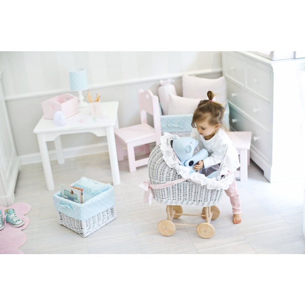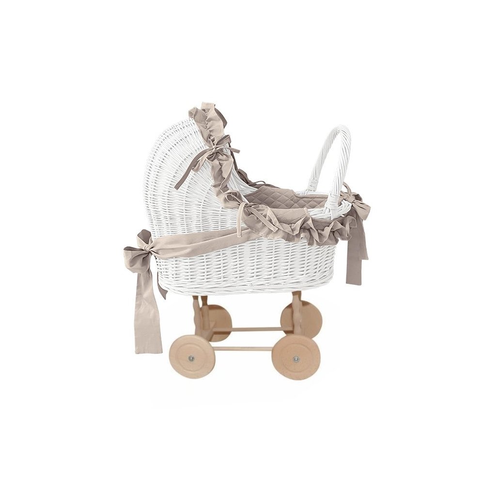 Jedinečný kočík pre všetky malé maminky a ich bábiky. Urobte radosť dievčatkám týmto originálnym kočíkom. Krásny prútený kočík s bielymi a béžovými prvkami. Je ručne vyrobený z najkvalitnejšieho prútia, lakovaného na bielo a je ozdobený bielym bavlneným riasením a bledošedou vnútornou časťou. Veľmi krásna a atraktívna hračka pre vaše dieťatko.
