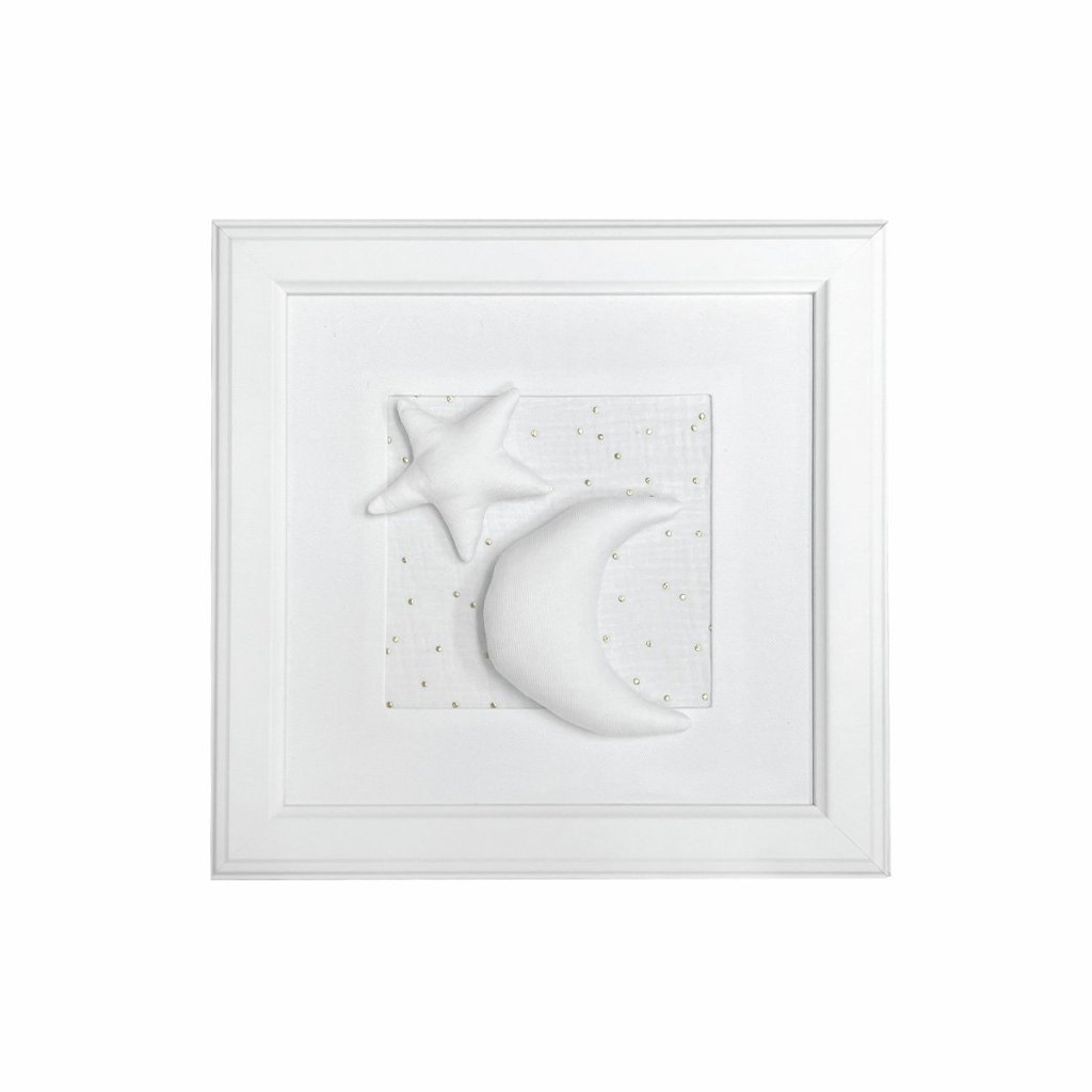 Obrazy pre deti vytvoria rozprávkovú detskú izbu. Zhmotnite ich detské sny do reálnej podoby! Krásny biely obrázok s mesiacom a hviezdou. Vnútorná časť obrazu je vyrobená z mäkkého textilu. Trojrozmerný mesiac a hviezda sú vyrobené z bielej bavlny. Pozadie je vyrobené z trblietavého zlatého bodkovaného textilu. Krásna dekorácia do detskej izby.