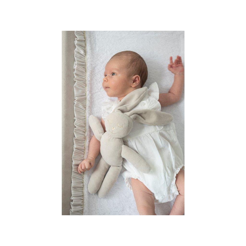 Rozkošný ručne vyrábaný zajačik s hrkálkou z béžového prešívaného velúru. Určite sa stane obľúbenou hračkou každého dieťaťa a zároveň bude nevšednou dekoráciou v detskej izbičke.