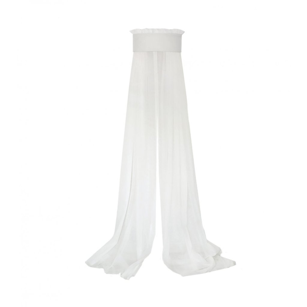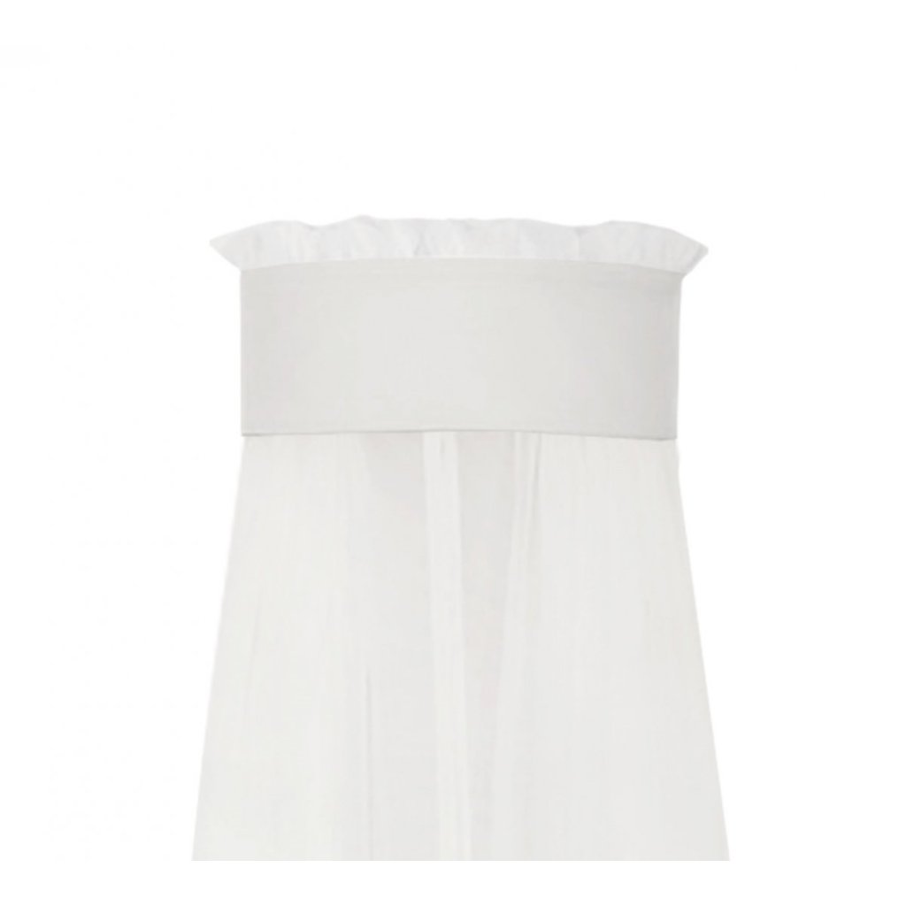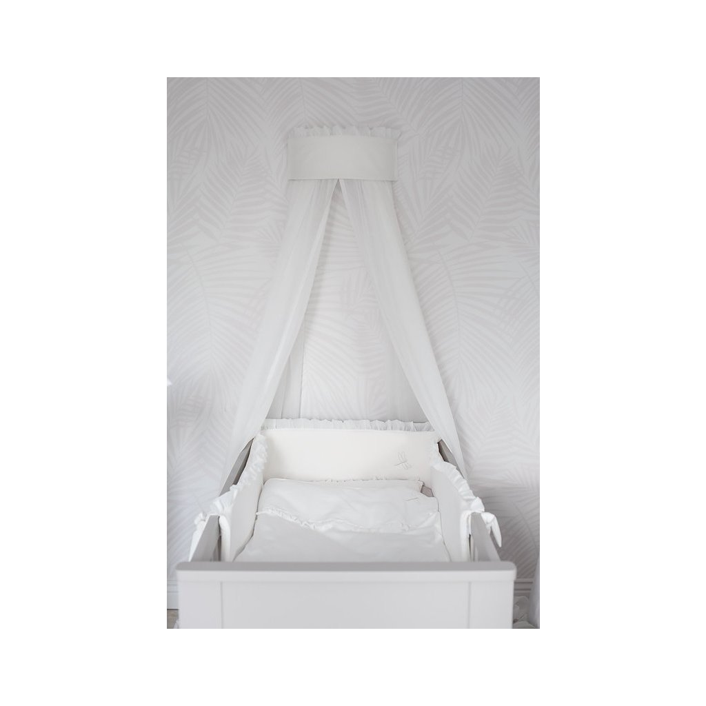 Krásny baldachýn do detskej izby. Vyrobený zo saténovej bielej bavlny a obohatený o elegantnú slonovinovú ozdobnú časť v tvare polkruhu. Upevnenie je potiahnuté slonovinovou prešívanou látkou.