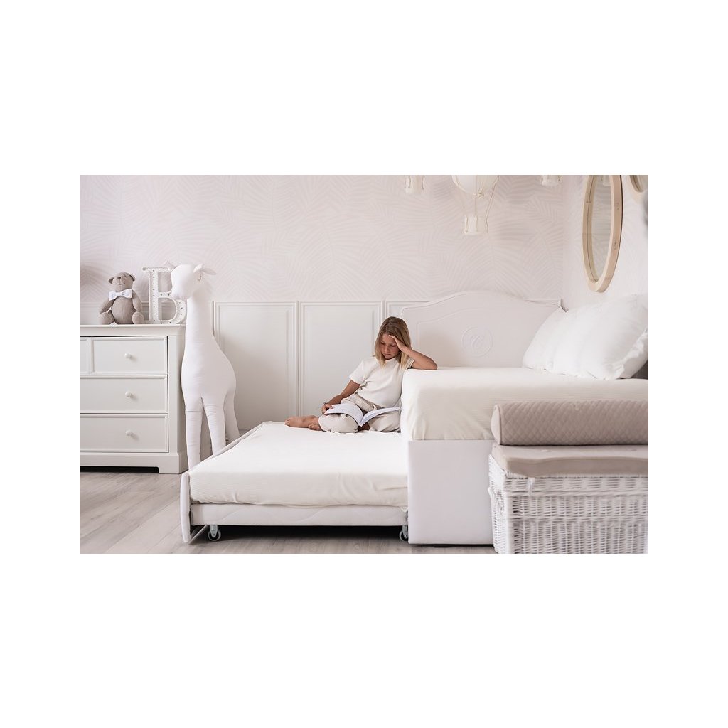 Elegantná detská posteľ s exkluzívnou výšivkou s písmenom „C“. Čelo postele a rám sú čalúnené kvalitnou umývateľnou textíliou vo farbe slonovej kosti, vďaka čomu je nábytok ešte funkčnejší.