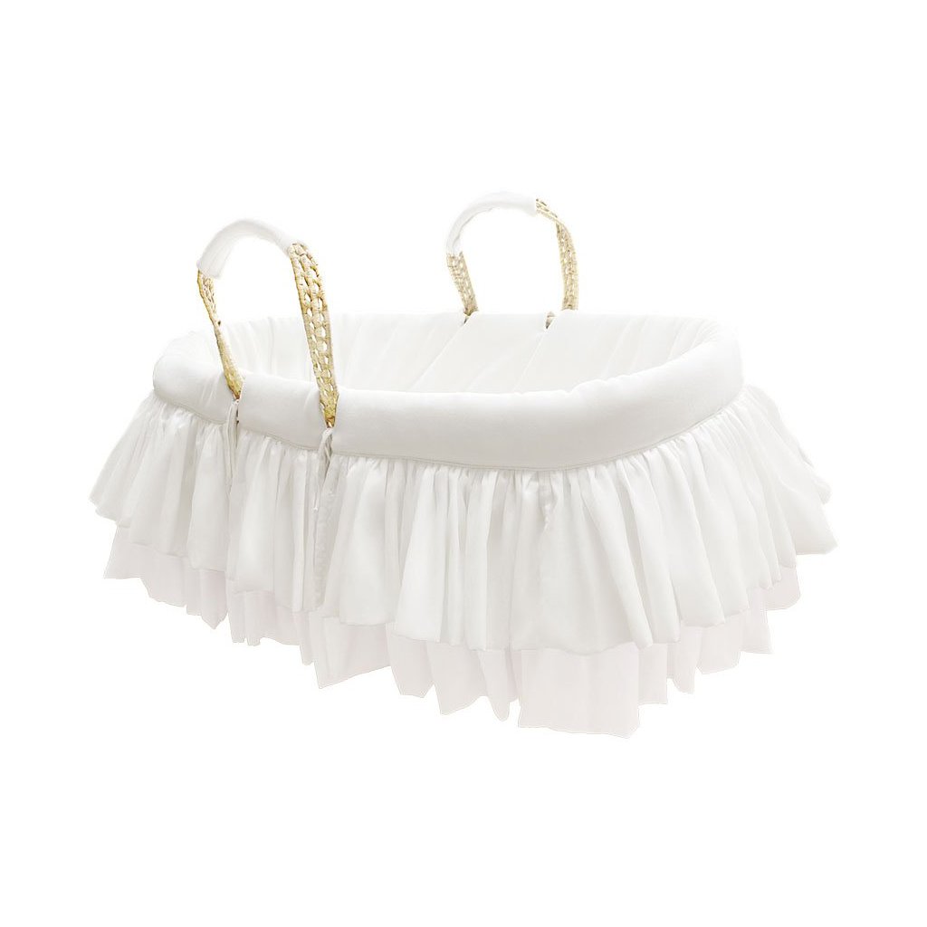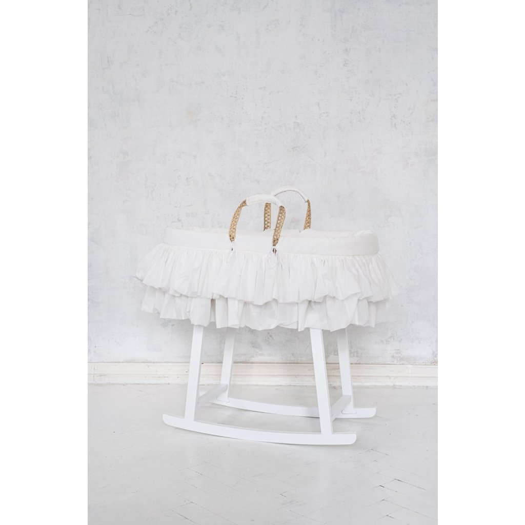 Rozkošný kôš Mojžiš vyrobený z palmových listov bezpečný pre dieťa. Má prešívanú bavlnenú textilnú podšívku v slonovinovej farbe (zaväzuje sa malými ramienkami), v spodnej časti má oválny piškótový matrac.