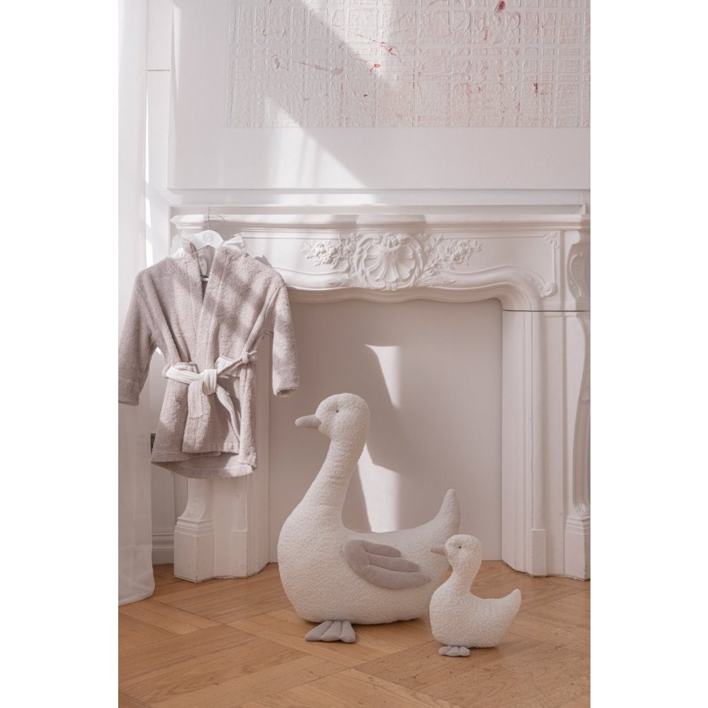 Dievčenský župan z exkluzívnej kolekcie Ivory Mist. Je starostlivo vyrobený, obšitý béžovou froté látkou a velúrovými vložkami zo slonoviny. Kapucňa a vrecká sú zakončené priehľadným voálovým volánom. Ideálne ako darček.