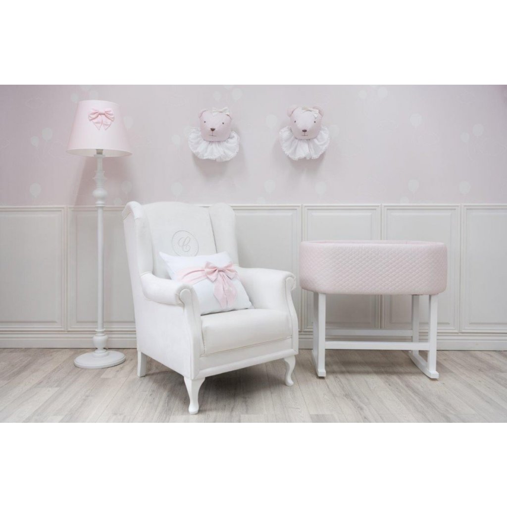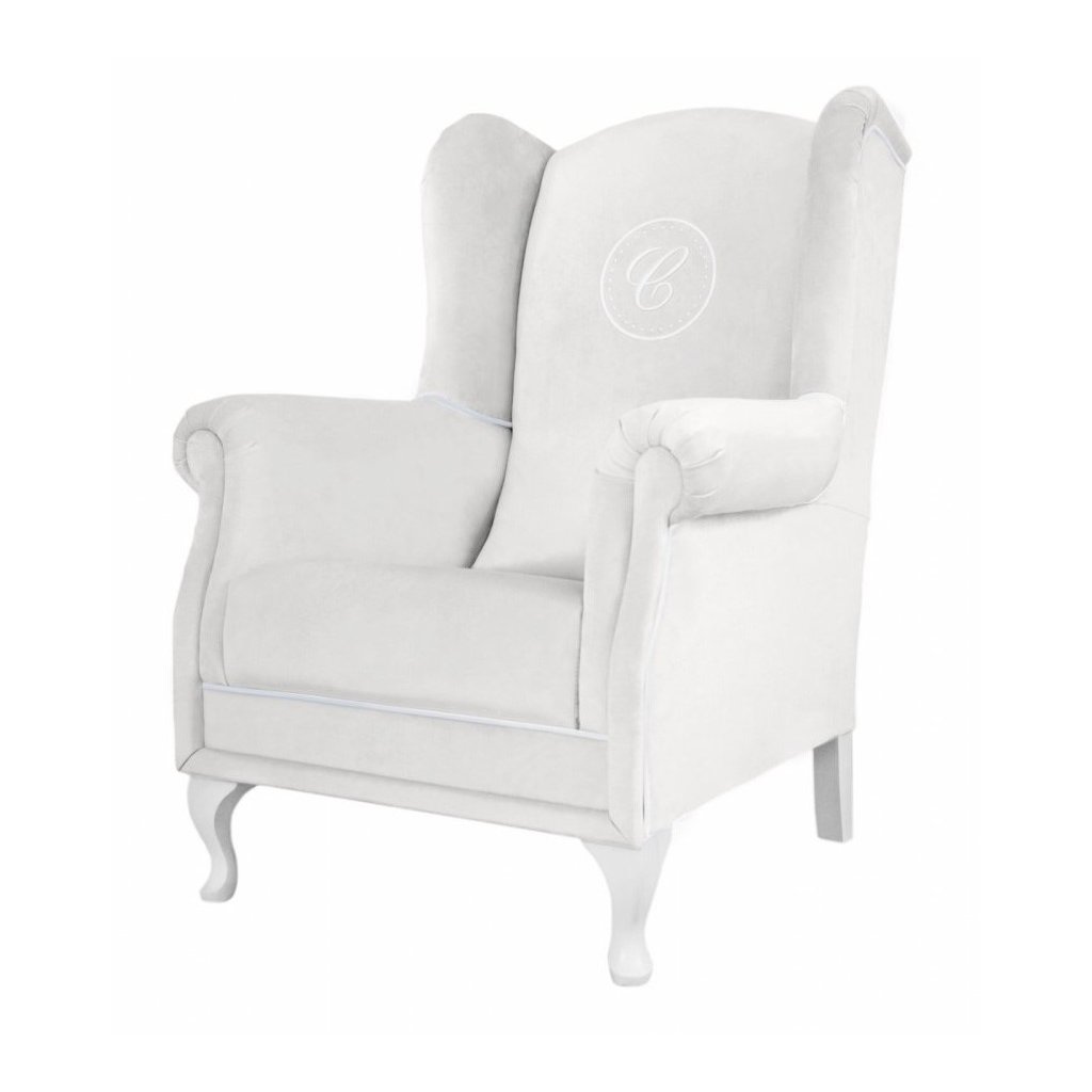 Veľké a veľmi pohodlné kreslo potiahnuté kvalitným umývateľným materiálom v slonovinovej farbe. Kreslo je zdobené elegantnou bielou dekoráciou a exkluzívnym znakom s písmenom „C“ v bielej farbe. Toto kreslo ocení každá dojčiaca mamička vzhľadom na vysoké opierky na hlavu a lakťové opierky. Kreslo zapadá do každého interiéru - detskej izby, obývacej izby, spálne a ďalších.